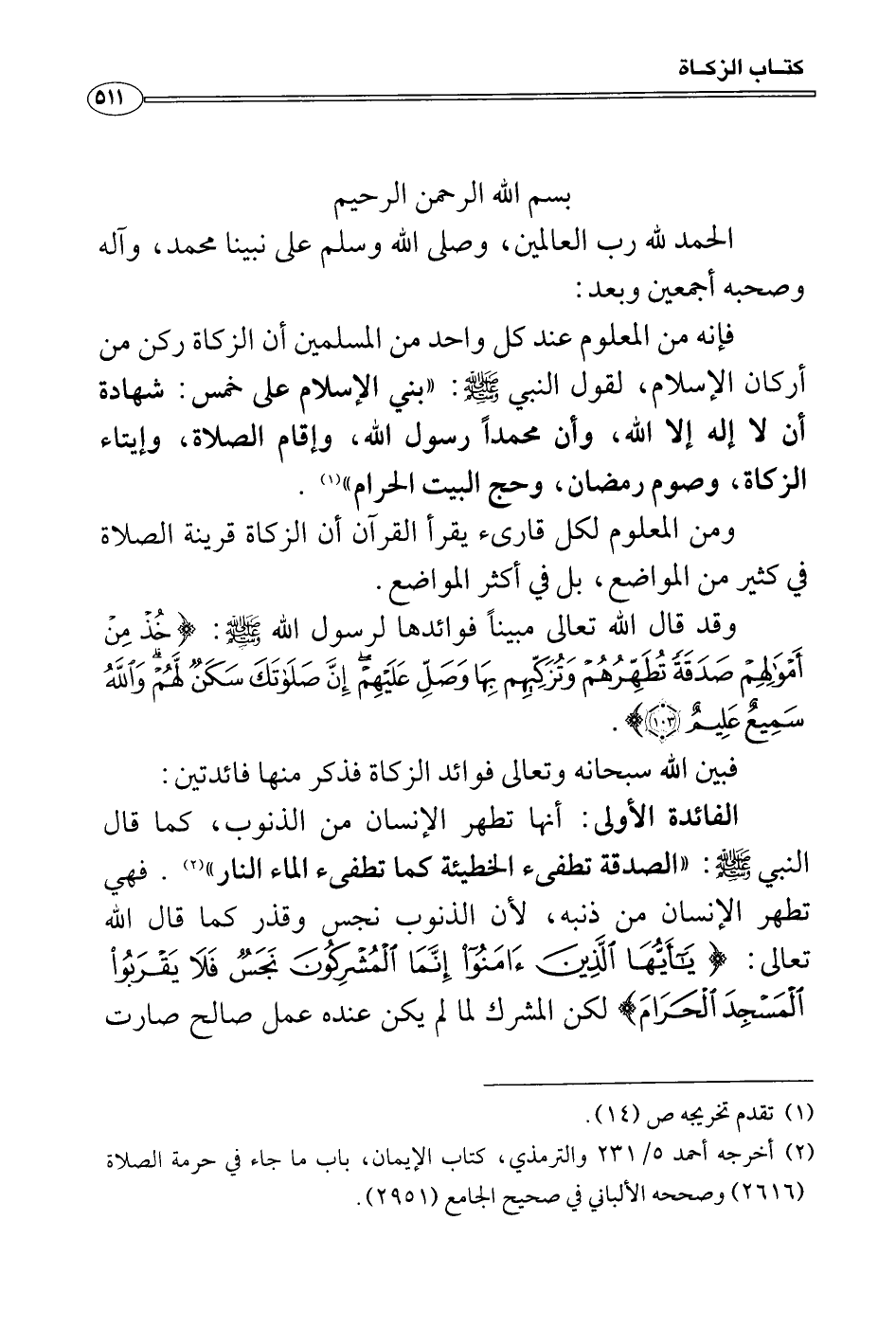 فإنه من المعلوم عند كل واحد من المسلمين أن الزكاة ركن من أركان الإسلام، لقول النبي صَلَّى اللَّهُ عَلَيْهِ وَسَلَّمَ: «بني الإسلام على خمس: شهادة أن لا إله إلا الله، وأن محمداً رسول الله، وإقام الصلاة، وإيتاء الزكاة، وصوم رمضان، وحج البيت الحرام» .