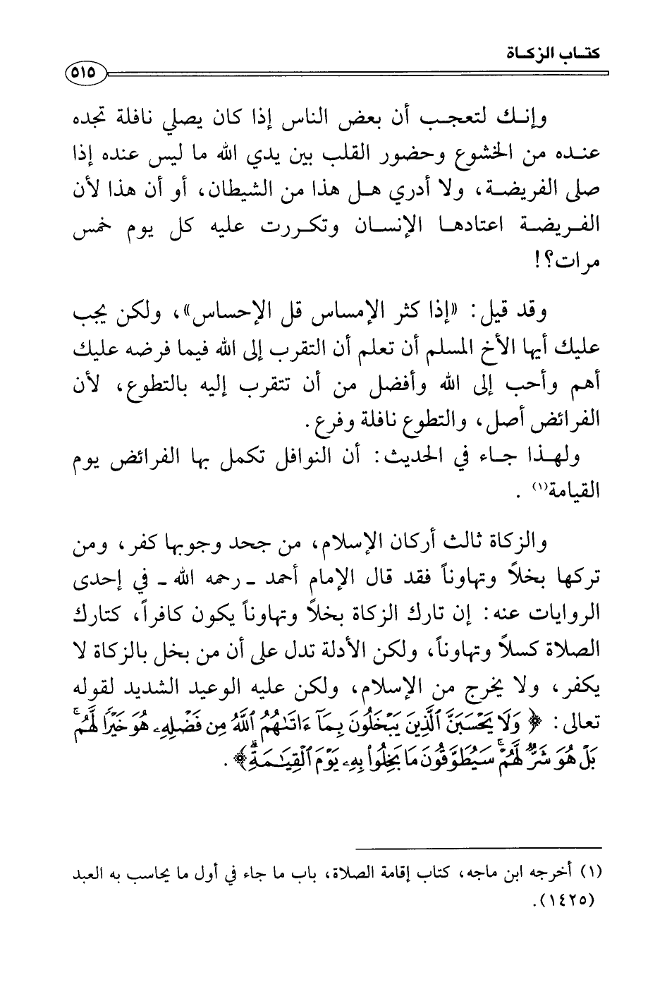 وقد قيل: «إذا كثر الإمساس قل الإحساس» ، ولكن يجب عليك أيها الأخ المسلم أن تعلم أن التقرب إلى الله فيما فرضه عليك أهم وأحب إلى الله وأفضل من أن تتقرب إليه بالتطوع، لأن الفرائض أصل، والتطوع نافلة وفرع.