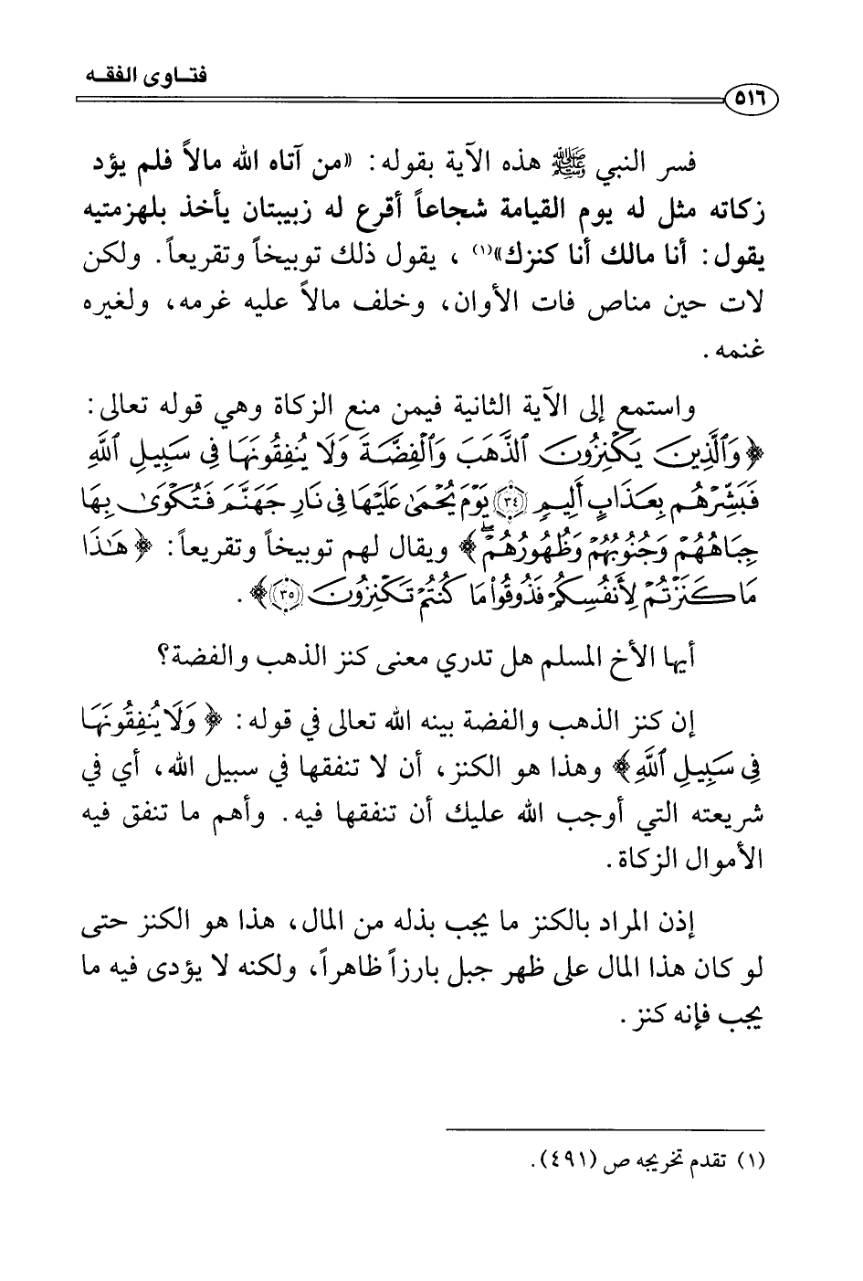 إن كنز الذهب والفضة بينه الله تعالى في قوله: {وَلاَ يُنفِقُونَهَا فِي سَبِيلِ اللهِ فَبَشِّرْهُمْ بِعَذَابٍ أَلِيمٍ} وهذا هو الكنز، أن لا تنفقها في سبيل الله، أي في شريعته التي أوجب الله عليك أن تنفقها فيه. وأهم ما تنفق فيه الأموال الزكاة.