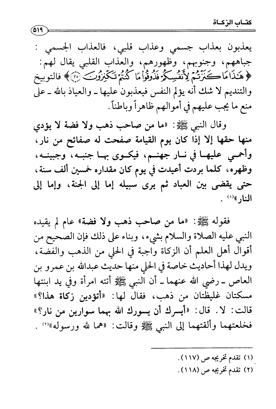 فقوله صَلَّى اللَّهُ عَلَيْهِ وَسَلَّمَ: «ما من صاحب ذهب ولا فضة» عام لم يقيده النبي عليه الصلاة والسلام بشيء، وبناء على ذلك فإن الصحيح من أقوال أهل العلم أن الزكاة واجبة في الحلي من الذهب والفضة، ويدل لهذا أحاديث خاصة في الحلي منها حديث عبد الله بن عمرو بن العاص رضي الله عنهما أن النبي صَلَّى اللَّهُ عَلَيْهِ وَسَلَّمَ أتته امرأة وفي يد ابنتها مسكتان غليظتان من ذهب، فقال لها: «أتؤدين زكاة هذا؟» قالت: لا. قال: «أيسرك أن يسورك الله بهما سوارين من نار؟» فخلعتهما وألقتهما إلى النبي صَلَّى اللَّهُ عَلَيْهِ وَسَلَّمَ وقالت: «هما لله ورسوله» .