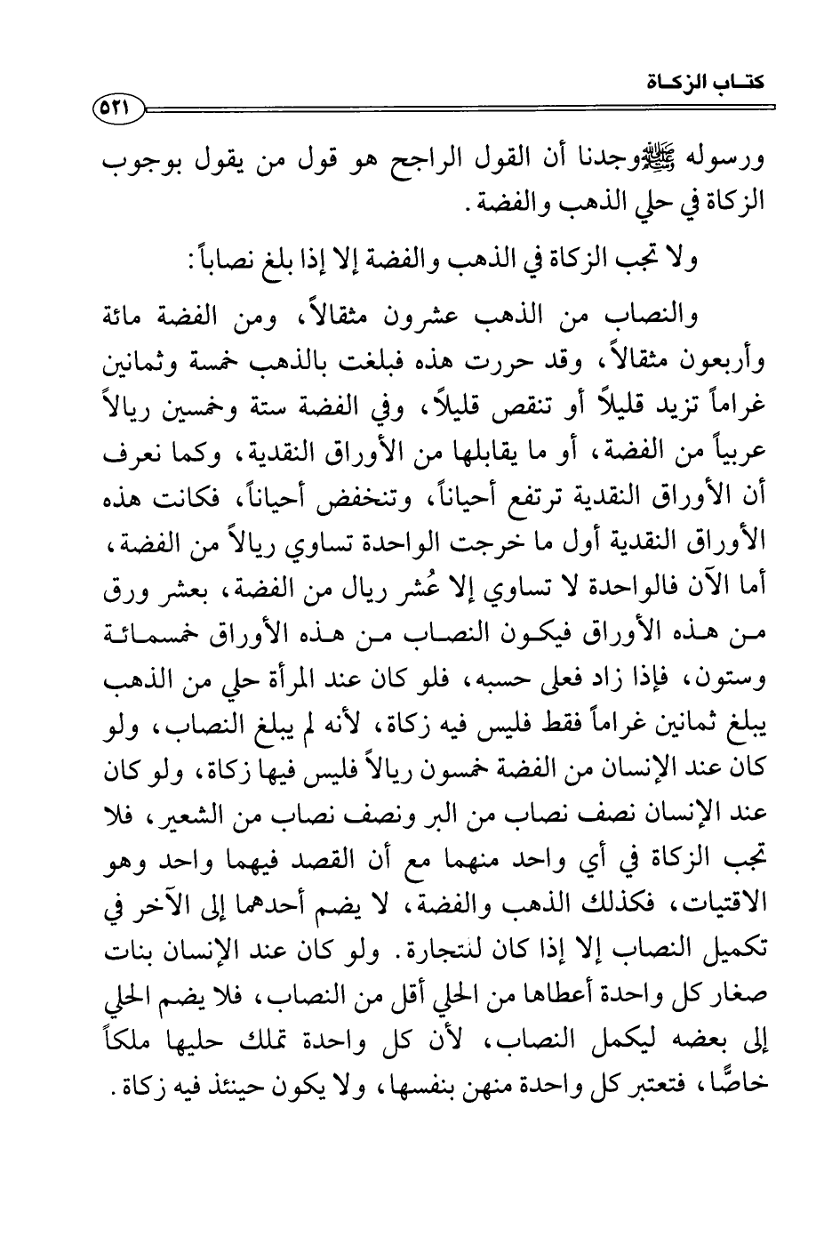 والنصاب من الذهب عشرون مثقالاً، ومن الفضة مائة وأربعون مثقالاً، وقد حررت هذه فبلغت بالذهب خمسة وثمانين غراماً تزيد قليلاً أو تنقص قليلاً، وفي الفضة ستة وخمسين ريالاً عربياً من الفضة، أو ما يقابلها من الأوراق النقدية، وكما نعرف أن الأوراق النقدية ترتفع أحياناً، وتنخفض أحياناً، فكانت هذه الأوراق النقدية أول ما خرجت الواحدة تساوي ريالاً من الفضة، أما الآن فالواحدة لا تساوي إلا عُشر ريال من الفضة، بعشر ورق من هذه الأوراق فيكون النصاب من هذه الأوراق خمسمائة وستون، فإذا زاد فعلى حسبه، فلو كان عند المرأة حلي من الذهب يبلغ ثمانين غراماً فقط فليس فيه زكاة، لأنه لم يبلغ النصاب، ولو كان عند الإنسان من الفضة خمسون ريالاً فليس فيها زكاة، ولو كان عند الإنسان نصف نصاب من البر ونصف نصاب من الشعير، فلا تجب الزكاة في أي واحد منهما مع أن القصد فيهما واحد وهو الاقتيات، فكذلك الذهب والفضة، لا يضم أحدهما إلى الآخر في تكميل النصاب إلا إذا كان للتجارة. ولو كان عند الإنسان بنات صغار كل واحدة أعطاها من الحلي أقل من النصاب، فلا يضم الحلي إلى بعضه ليكمل النصاب، لأن كل واحدة تملك حليها ملكاً خاصًّا، فتعتبر كل واحدة منهن بنفسها، ولا يكون حينئذ فيه زكاة.