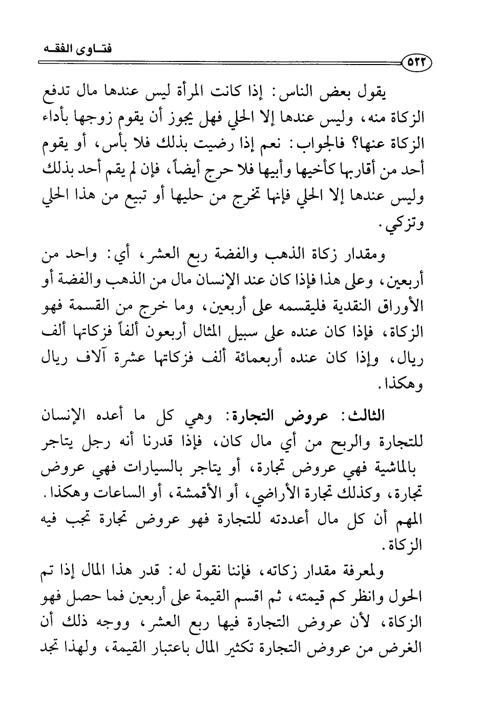 الثالث: عروض التجارة: وهي كل ما أعده الإنسانللتجارة والربح من أي مال كان، فإذا قدرنا أنه رجل يتاجر بالماشية فهي عروض تجارة، أو يتاجر بالسيارات فهي عروض تجارة، وكذلك تجارة الأراضي، أو الأقمشة، أو الساعات وهكذا. المهم أن كل مال أعددته للتجارة فهو عروض تجارة تجب فيه الزكاة.
