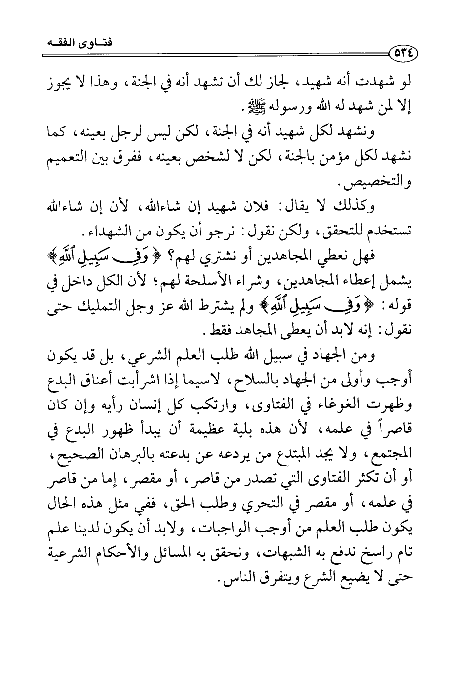 ومن الجهاد في سبيل الله طلب العلم الشرعي، بل قد يكون أوجب وأولى من الجهاد بالسلاح، لاسيما إذا اشرأبت أعناق البدع وظهرت الغوغاء في الفتاوى، وارتكب كل إنسان رأيه وإن كان قاصراً في علمه، لأن هذه بلية عظيمة أن يبدأ ظهور البدع في المجتمع، ولا يجد المبتدع من يردعه عن بدعته بالبرهان الصحيح، أو أن تكثر الفتاوى التي تصدر من قاصر، أو مقصر، إما من قاصر في علمه، أو مقصر في التحري وطلب الحق، ففي مثل هذه الحال يكون طلب العلم من أوجب الواجبات، ولابد أن يكون لدينا علم تام راسخ ندفع به الشبهات، ونحقق به المسائل والأحكام الشرعية حتى لا يضيع الشرع ويتفرق الناس.