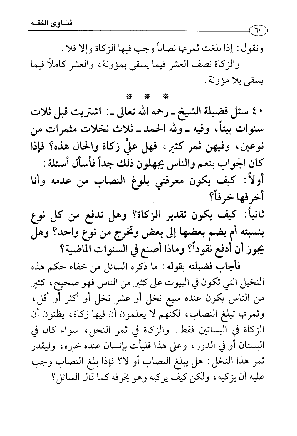 سئل فضيلة الشيخ - رحمه الله تعالى -: اشتريت قبل ثلاث سنوات بيتاً، وفيه - ولله الحمد - ثلاث نخلات مثمرات من نوعين، وفيهن ثمر كثير، فهل علَّي زكاة والحال هذه؟ فإذا كان الجواب بنعم والناس يجهلون ذلك جداً فأسأل أسئلة: