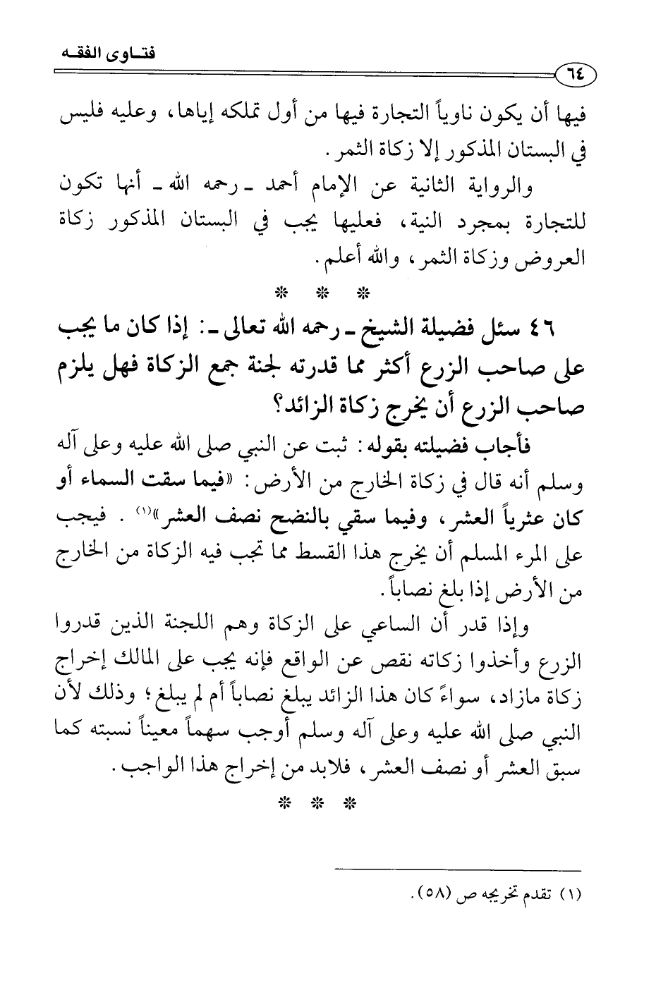 فأجاب فضيلته بقوله: ثبت عن النبي صلى الله عليه وعلى آله وسلم أنه قال في زكاة الخارج من الأرض: «فيما سقت السماء أو كان عثرياً العشر، وفيما سقي بالنضح نصف العشر» . فيجب على المرء المسلم أن يخرج هذا القسط مما تجب فيه الزكاة من الخارج من الأرض إذا بلغ نصاباً.