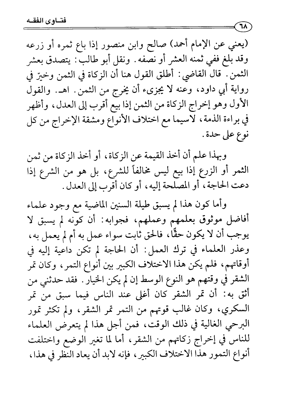 يعني عن الإمام أحمد) صالح وابن منصور إذا باع ثمره أو زرعه وقد بلغ ففي ثمنه العشر أو نصفه. ونقل أبو طالب: يتصدق بعشر الثمن. قال القاضي: أطلق القول هنا أن الزكاة في الثمن وخيّر في رواية أبي داود، وعنه لا يجزىء أن يخرج من الثمن. اه. والقول الأول وهو إخراج الزكاة من الثمن إذا بيع أقرب إلى العدل، وأظهر في براءة الذمة، لاسيما مع اختلاف الأنواع ومشقة الإخراج من كل نوع على حدة.