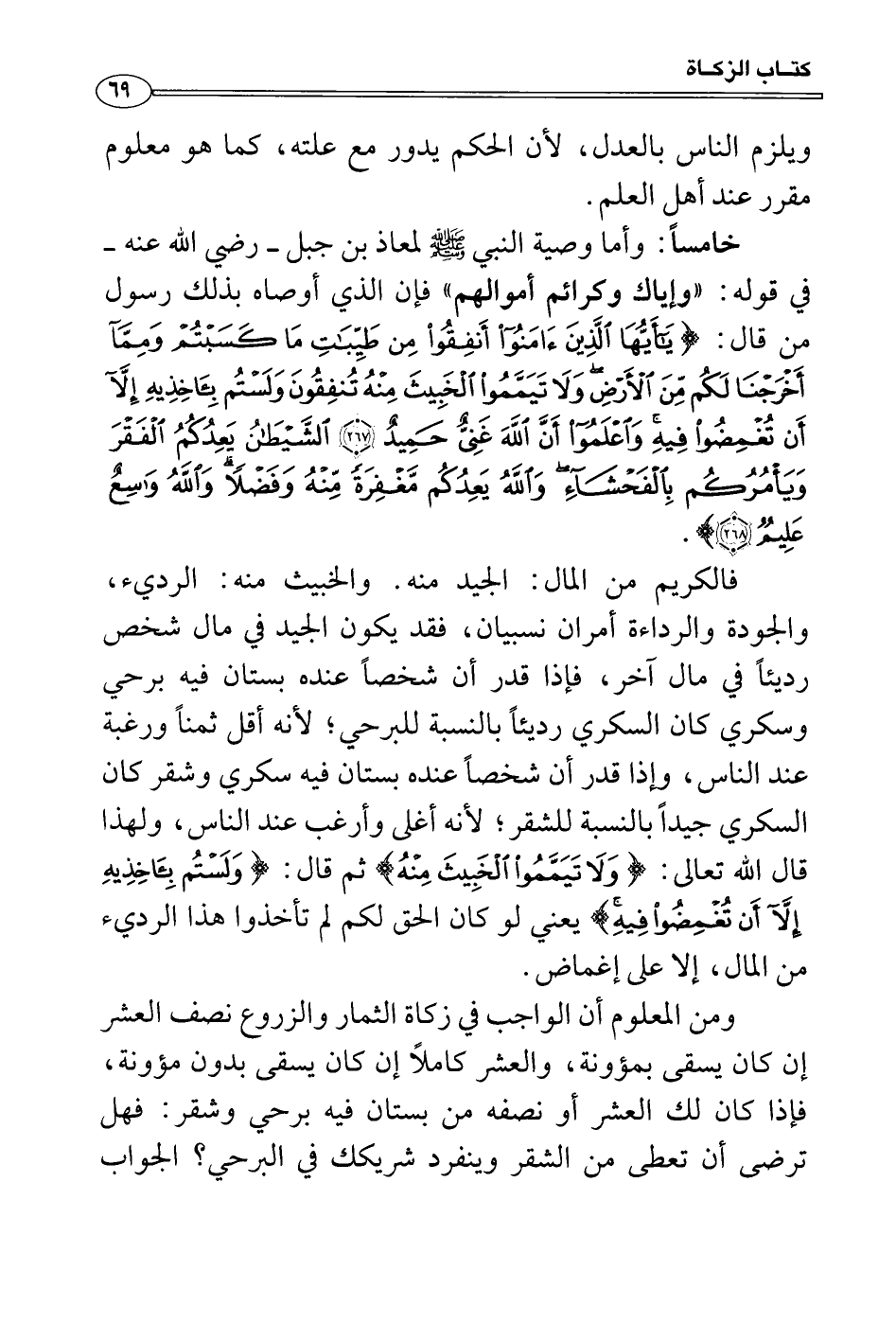 خامساً: وأما وصية النبي صَلَّى اللَّهُ عَلَيْهِ وَسَلَّمَ لمعاذ بن جبل رضي الله عنه في قوله: «وإياك وكرائم أموالهم» فإن الذي أوصاه بذلك رسول من قال: {ياأَيُّهَا الَّذِينَءَامَنُو"اْ أَنفِقُواْ مِن طَيِّبَاتِ مَا كَسَبْتُمْ وَمِمَّآ أَخْرَجْنَا لَكُم مِّنَ الأَْرْضِ وَلاَ تَيَمَّمُواْ الْخَبِيثَ مِنْهُ تُنفِقُونَ وَلَسْتُم بِأَخِذِيهِ إِلاّ" أَن تُغْمِضُواْ فِيهِ وَاعْلَمُو"اْ أَنَّ اللهَ غَنِيٌّ حَمِيدٌ * الشَّيْطَانُ يَعِدُكُمُ الْفَقْرَ وَيَأْمُرُكُم بِالْفَحْشَآءِ وَاللهُ يَعِدُكُم مَّغْفِرَةً مِّنْهُ وَفَضْلاً وَاللهُ وَاسِعٌ عَلِيمٌ} .