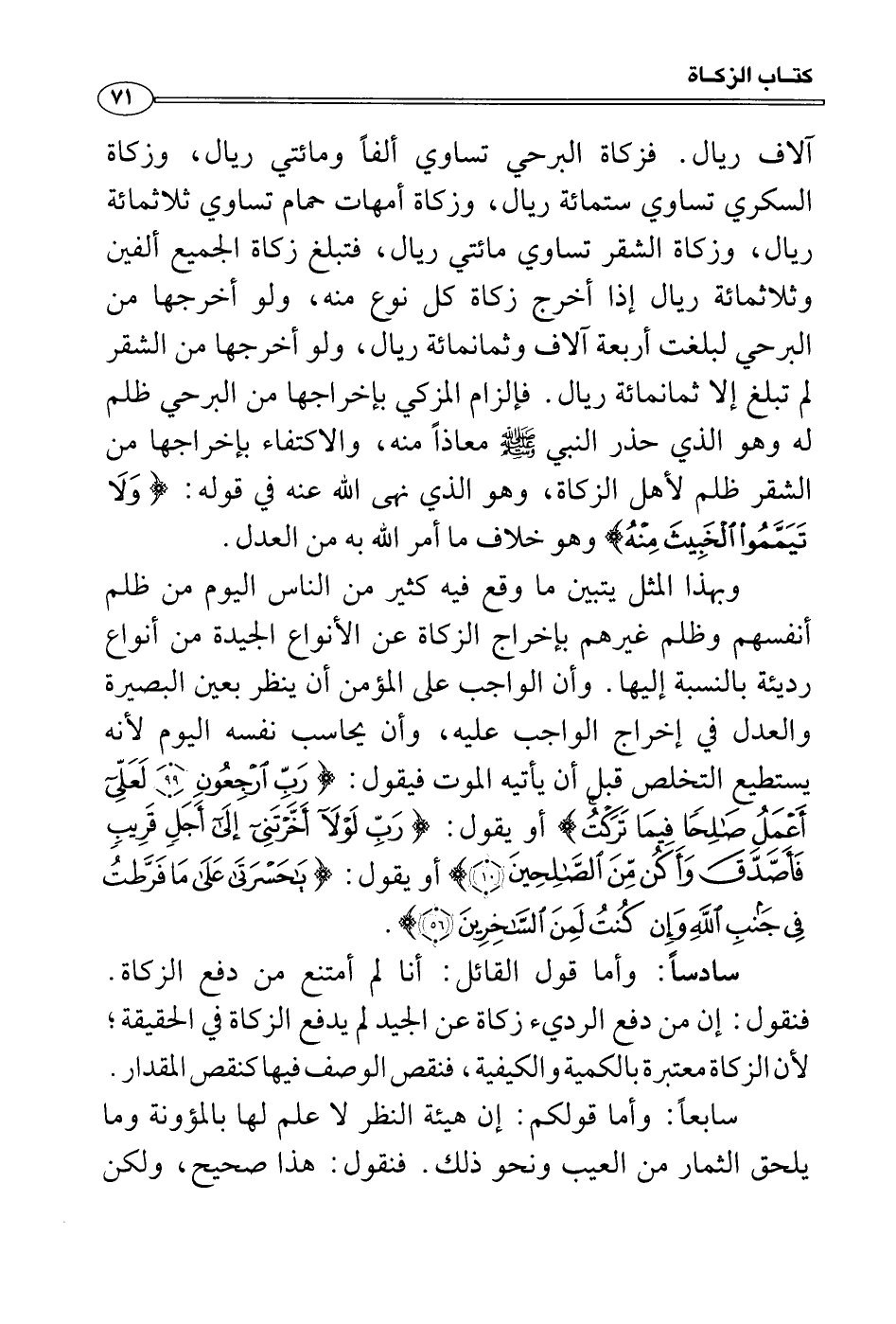 آلاف ريال. فزكاة البرحي تساوي ألفاً ومائتي ريال، وزكاة السكري تساوي ستمائة ريال، وزكاة أمهات حمام تساوي ثلاثمائة ريال، وزكاة الشقر تساوي مائتي ريال، فتبلغ زكاة الجميع ألفين وثلاثمائة ريال إذا أخرج زكاة كل نوع منه، ولو أخرجها من البرحي لبلغت أربعة آلاف وثمانمائة ريال، ولو أخرجها من الشقر لم تبلغ إلا ثمانمائة ريال. فإلزام المزكي بإخراجها من البرحي ظلم له وهو الذي حذر النبي صَلَّى اللَّهُ عَلَيْهِ وَسَلَّمَ معاذاً منه، والاكتفاء بإخراجها من الشقر ظلم لأهل الزكاة، وهو الذي نهى الله عنه في قوله: {وَلاَ تَيَمَّمُواْ الْخَبِيثَ مِنْهُ تُنفِقُونَ وَلَسْتُم بِأَخِذِيهِ إِلاّ" أَن تُغْمِضُواْ فِيهِ وَاعْلَمُو"اْ أَنَّ اللهَ غَنِيٌّ حَمِيدٌ} وهو خلاف ما أمر الله به من العدل.