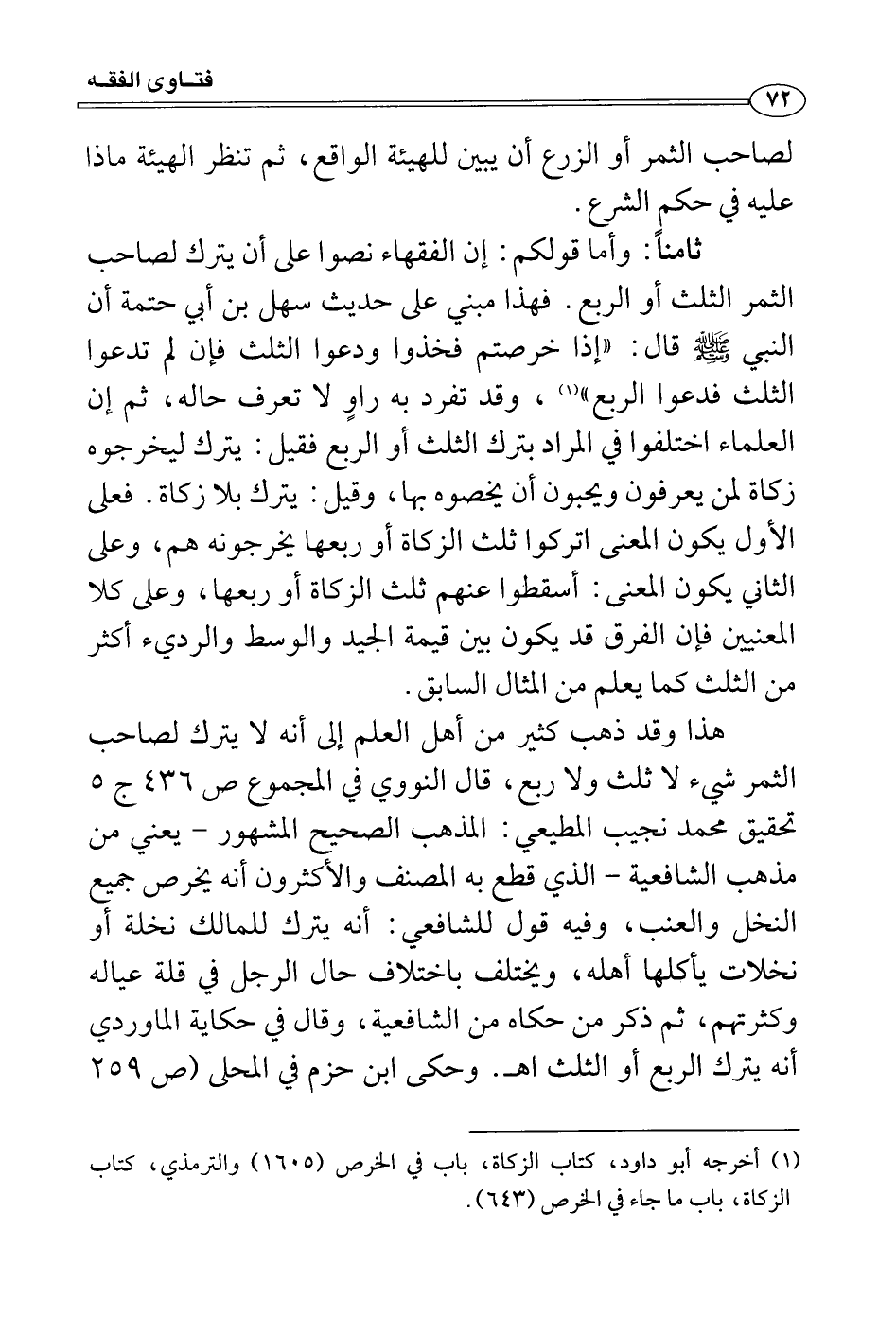 الثمر الثلث أو الربع. فهذا مبني على حديث سهل بن أبي حتمة أن النبي صَلَّى اللَّهُ عَلَيْهِ وَسَلَّمَ قال: «إذا خرصتم فخذوا ودعوا الثلث فإن لم تدعوا الثلث فدعوا الربع» ، وقد تفرد به راوٍ لا تعرف حاله، ثم إن العلماء اختلفوا في المراد بترك الثلث أو الربع فقيل: يترك ليخرجوه زكاة لمن يعرفون ويحبون أن يخصوه بها، وقيل: يترك بلا زكاة. فعلى الأول يكون المعنى اتركوا ثلث الزكاة أو ربعها يخرجونه هم، وعلى الثاني يكون المعنى: أسقطوا عنهم ثلث الزكاة أو ربعها، وعلى كلا المعنيين فإن الفرق قد يكون بين قيمة الجيد والوسط والرديء أكثر من الثلث كما يعلم من المثال السابق.