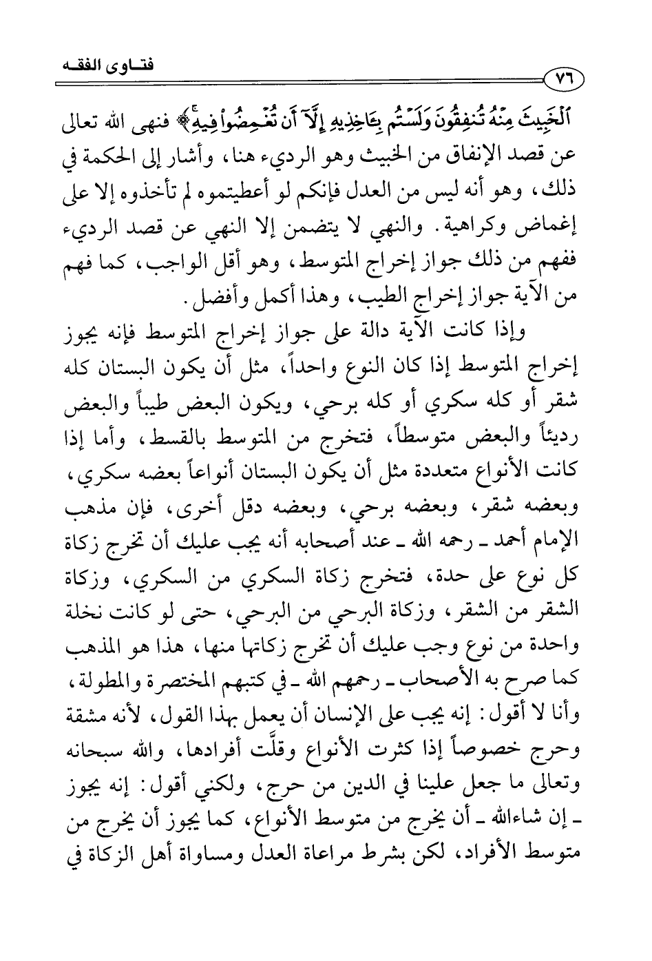 وإذا كانت الآية دالة على جواز إخراج المتوسط فإنه يجوز إخراج المتوسط إذا كان النوع واحداً، مثل أن يكون البستان كله شقر أو كله سكري أو كله برحي، ويكون البعض طيباً والبعض رديئاً والبعض متوسطاً، فتخرج من المتوسط بالقسط، وأما إذا كانت الأنواع متعددة مثل أن يكون البستان أنواعاً بعضه سكري، وبعضه شقر، وبعضه برحي، وبعضه دقل أخرى، فإن مذهب الإمام أحمد رحمه الله عند أصحابه أنه يجب عليك أن تخرج زكاة كل نوع على حدة، فتخرج زكاة السكري من السكري، وزكاة الشقر من الشقر، وزكاة البرحي من البرحي، حتى لو كانت نخلة واحدة من نوع وجب عليك أن تخرج زكاتها منها، هذا هو المذهب كما صرح به الأصحاب رحمهم الله في كتبهم المختصرة والمطولة، وأنا لا أقول: إنه يجب على الإنسان أن يعمل بهذا القول، لأنه مشقة وحرج خصوصاً إذا كثرت الأنواع وقلَّت أفرادها، والله سبحانه وتعالى ما جعل علينا في الدين من حرج، ولكني أقول: إنه يجوز إن شاءالله أن يخرج من متوسط الأنواع، كما يجوز أن يخرج من متوسط الأفراد، لكن بشرط مراعاة العدل ومساواة أهل الزكاة في