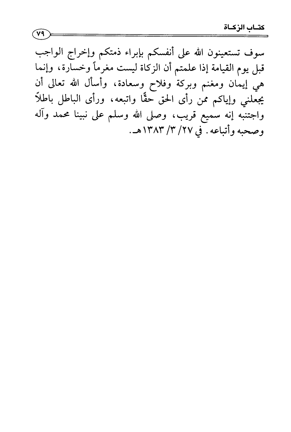 سوف تستعينون الله على أنفسكم بإبراء ذمتكم وإخراج الواجب قبل يوم القيامة إذا علمتم أن الزكاة ليست مغرماً وخسارة، وإنما هي إيمان ومغنم وبركة وفلاح وسعادة، وأسأل الله تعالى أن يجعلني وإياكم ممن رأى الحق حقًّا واتبعه، ورأى الباطل باطلاً واجتنبه إنه سميع قريب، وصلى الله وسلم على نبينا محمد وآله وصحبه وأتباعه. في 27/3/1383 هـ.