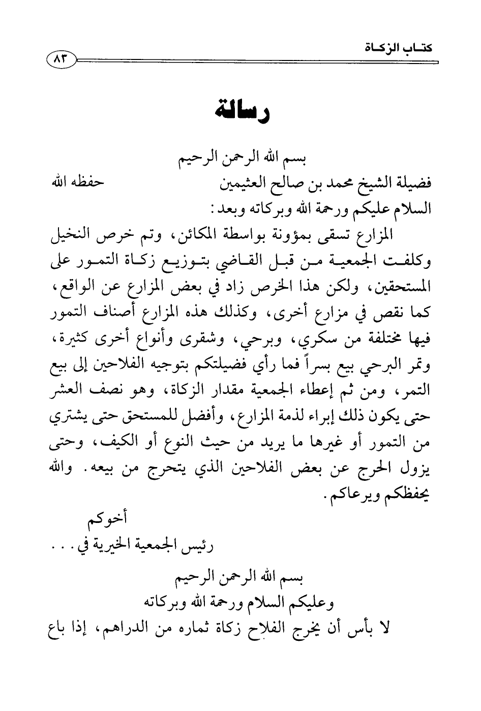 المزارع تسقى بمؤونة بواسطة المكائن، وتم خرص النخيل وكلفت الجمعية من قبل القاضي بتوزيع زكاة التمور على المستحقين، ولكن هذا الخرص زاد في بعض المزارع عن الواقع، كما نقص في مزارع أخرى، وكذلك هذه المزارع أصناف التمور فيها مختلفة من سكري، وبرحي، وشقرى وأنواع أخرى كثيرة، وتمر البرحي بيع بسراً فما رأي فضيلتكم بتوجيه الفلاحين إلى بيع التمر، ومن ثم إعطاء الجمعية مقدار الزكاة، وهو نصف العشر حتى يكون ذلك إبراء لذمة المزارع، وأفضل للمستحق حتى يشتري من التمور أو غيرها ما يريد من حيث النوع أو الكيف، وحتى يزول الحرج عن بعض الفلاحين الذي يتحرج من بيعه. والله يحفظكم ويرعاكم.