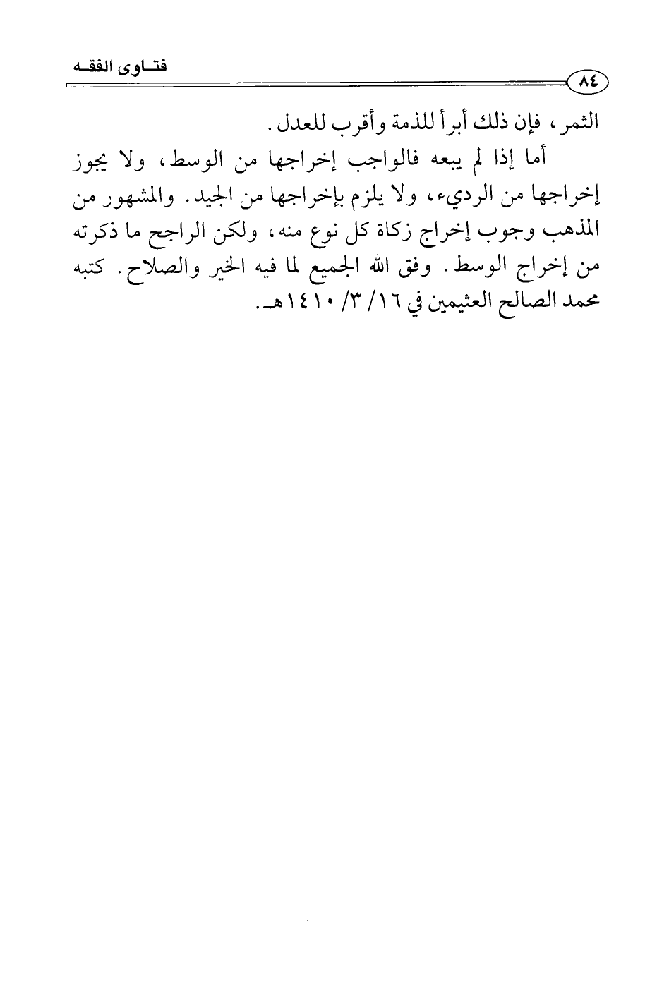 أما إذا لم يبعه فالواجب إخراجها من الوسط، ولا يجوز إخراجها من الرديء، ولا يلزم بإخراجها من الجيد. والمشهور من المذهب وجوب إخراج زكاة كل نوع منه، ولكن الراجح ما ذكرته من إخراج الوسط. وفق الله الجميع لما فيه الخير والصلاح. كتبه محمد الصالح العثيمين في 61/3/1410 هـ.