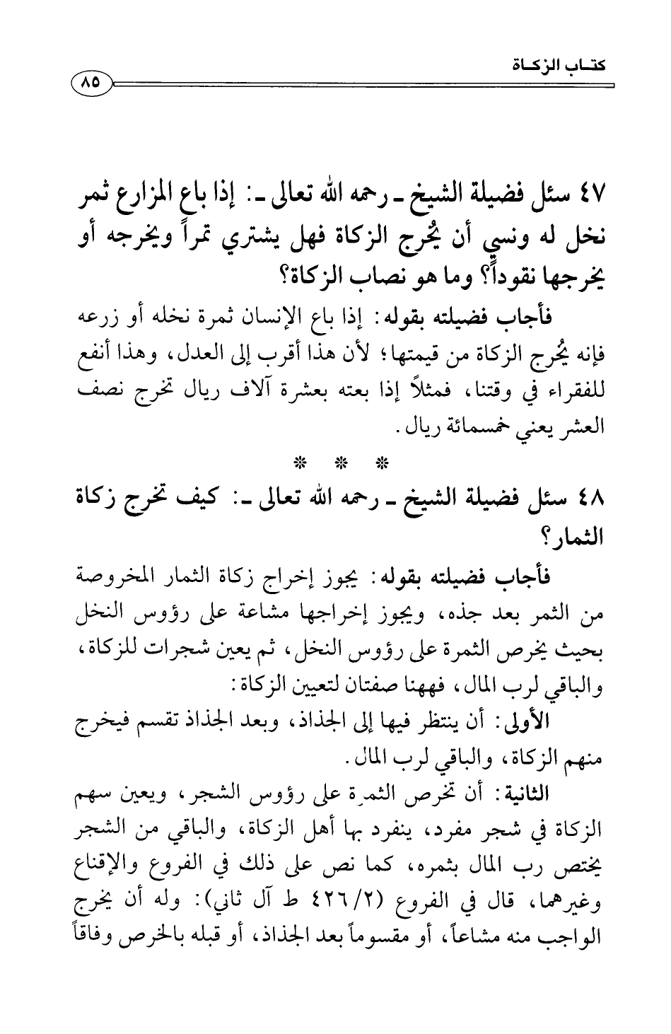 فأجاب فضيلته بقوله: يجوز إخراج زكاة الثمار المخروصة من الثمر بعد جذه، ويجوز إخراجها مشاعة على رؤوس النخل بحيث يخرص الثمرة على رؤوس النخل، ثم يعين شجرات للزكاة، والباقي لرب المال، فههنا صفتان لتعيين الزكاة: