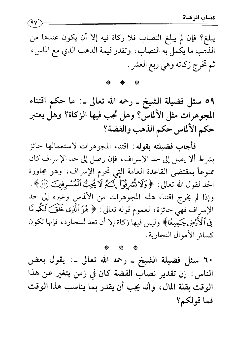 فأجاب فضيلته بقوله: اقتناء المجوهرات لاستعمالها جائز بشرط ألا يصل إلى حد الإسراف، فإن وصل إلى حد الإسراف كان ممنوعاً بمقتضى القاعدة العامة التي تحرم الإسراف، وهو مجاوزة الحد لقول الله تعالى: {وَلاَ تُسْرِفُو"اْ إِنَّهُ لاَ يُحِبُّ الْمُسْرِفِينَ} . وإذا لم يخرج اقتناء هذه المجوهرات من الألماس وغيره إلى حد الإسراف فهي جائزة؛ لعموم قوله تعالى: {هُوَ الَّذِى خَلَقَ لَكُم مَّا فِى الأَْرْضِ جَمِيعاً ثُمَّ اسْتَوَى إِلَى السَّمَآءِ فَسَوَّاهُنَّ سَبْعَ سَمَاوَاتٍ وَهُوَ بِكُلِّ شَىْءٍ عَلِيمٌ} وليس فيها زكاة إلا أن تعد للتجارة، فإنها تكون كسائر الأموال التجارية.