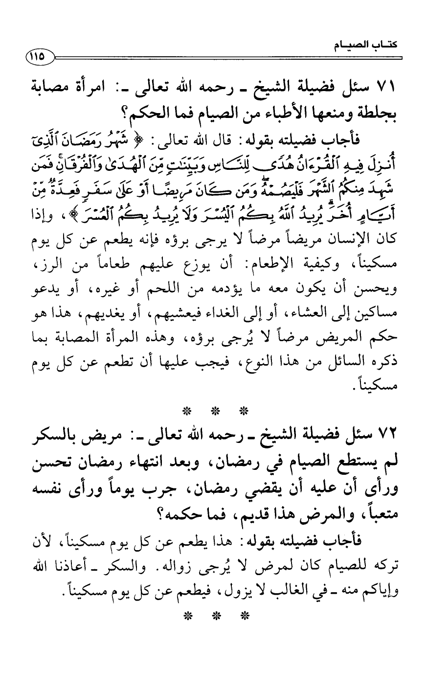 فأجاب فضيلته بقوله: قال الله تعالى: {شَهْرُ رَمَضَانَ الَّذِى" أُنزِلَ فِيهِ الْقُرْآنُ هُدًى لِّلنَّاسِ وَبَيِّنَاتٍ مِّنَ الْهُدَى وَالْفُرْقَانِ فَمَن شَهِدَ مِنكُمُ الشَّهْرَ فَلْيَصُمْهُ وَمَن كَانَ مَرِيضًا أَوْ عَلَى سَفَرٍ فَعِدَّةٌ مِّنْ أَيَّامٍ أُخَرَ يُرِيدُ اللهُ بِكُمُ الْيُسْرَ وَلاَ يُرِيدُ بِكُمُ الْعُسْرَ وَلِتُكْمِلُواْ الْعِدَّةَ وَلِتُكَبِّرُواْ اللهَ عَلَى مَا هَدَاكُمْ وَلَعَلَّكُمْ تَشْكُرُونَ} ، وإذا كان الإنسان مريضاً مرضاً لا يرجى برؤه فإنه يطعم عن كل يوم مسكيناً، وكيفية الإطعام: أن يوزع عليهم طعاماً من الرز، ويحسن أن يكون معه ما يؤدمه من اللحم أو غيره، أو يدعو مساكين إلى العشاء، أو إلى الغداء فيعشيهم، أو يغديهم، هذا هو حكم المريض مرضاً لا يُرجى برؤه، وهذه المرأة المصابة بما ذكره السائل من هذا النوع، فيجب عليها أن تطعم عن كل يوم مسكيناً.