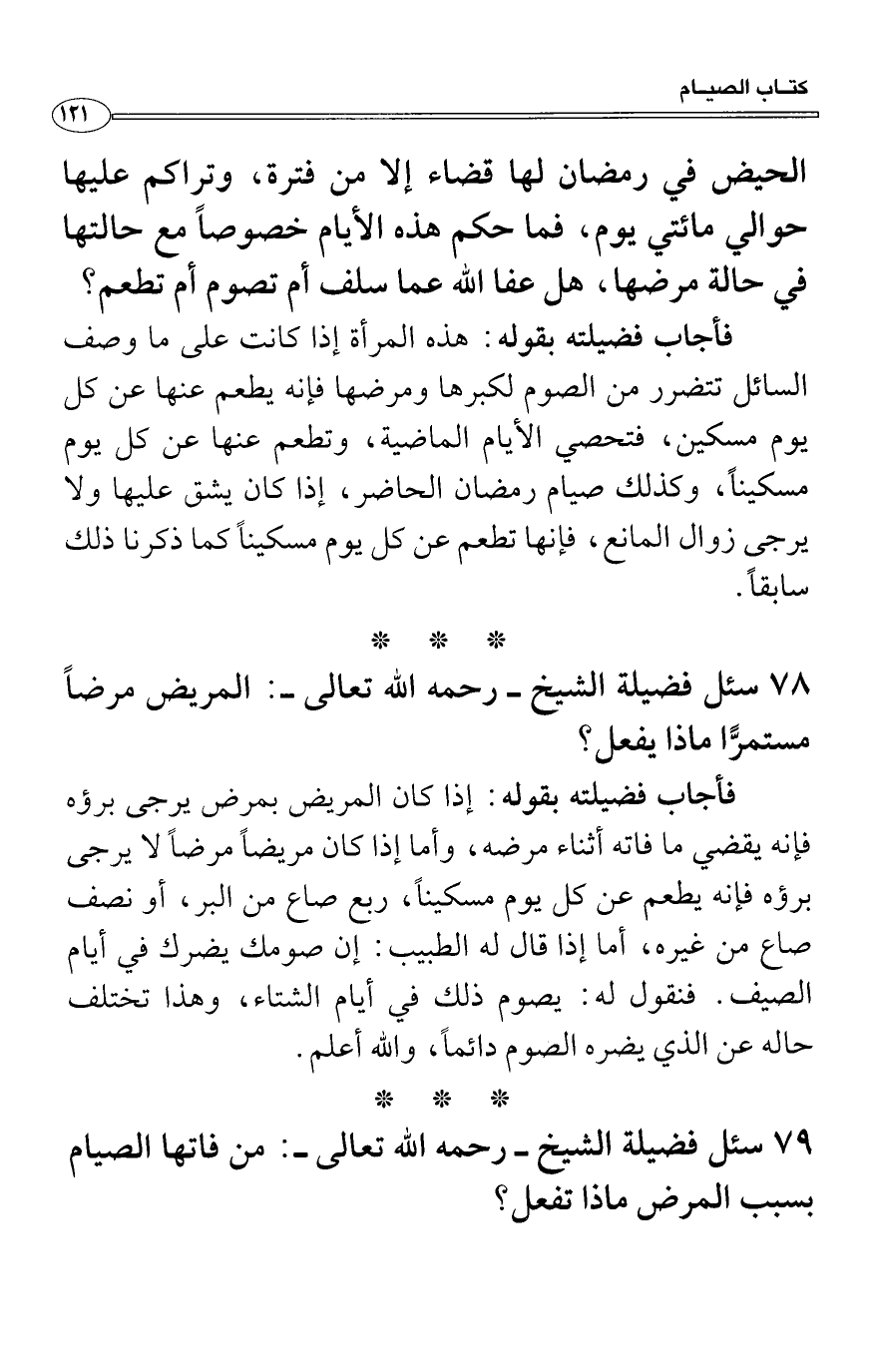 سئل فضيلة الشيخ - رحمه الله تعالى -: من فاتها الصيام بسبب المرض ماذا تفعل؟