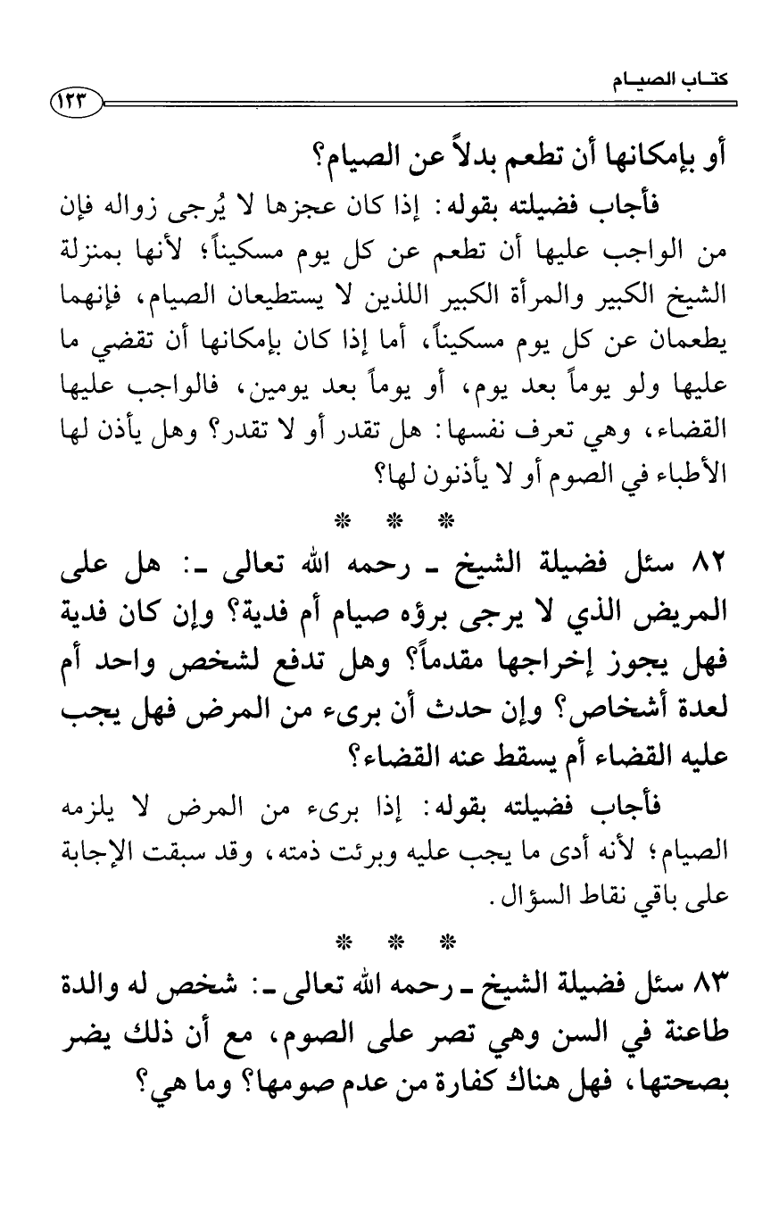 سئل فضيلة الشيخ - رحمه الله تعالى -: هل على المريض الذي لا يرجى برؤه صيام أم فدية؟ وإن كان فدية فهل يجوز إخراجها مقدماً؟ وهل تدفع لشخص واحد أم لعدة أشخاص؟ وإن حدث أن برىء من المرض فهل يجب عليه القضاء أم يسقط عنه القضاء؟