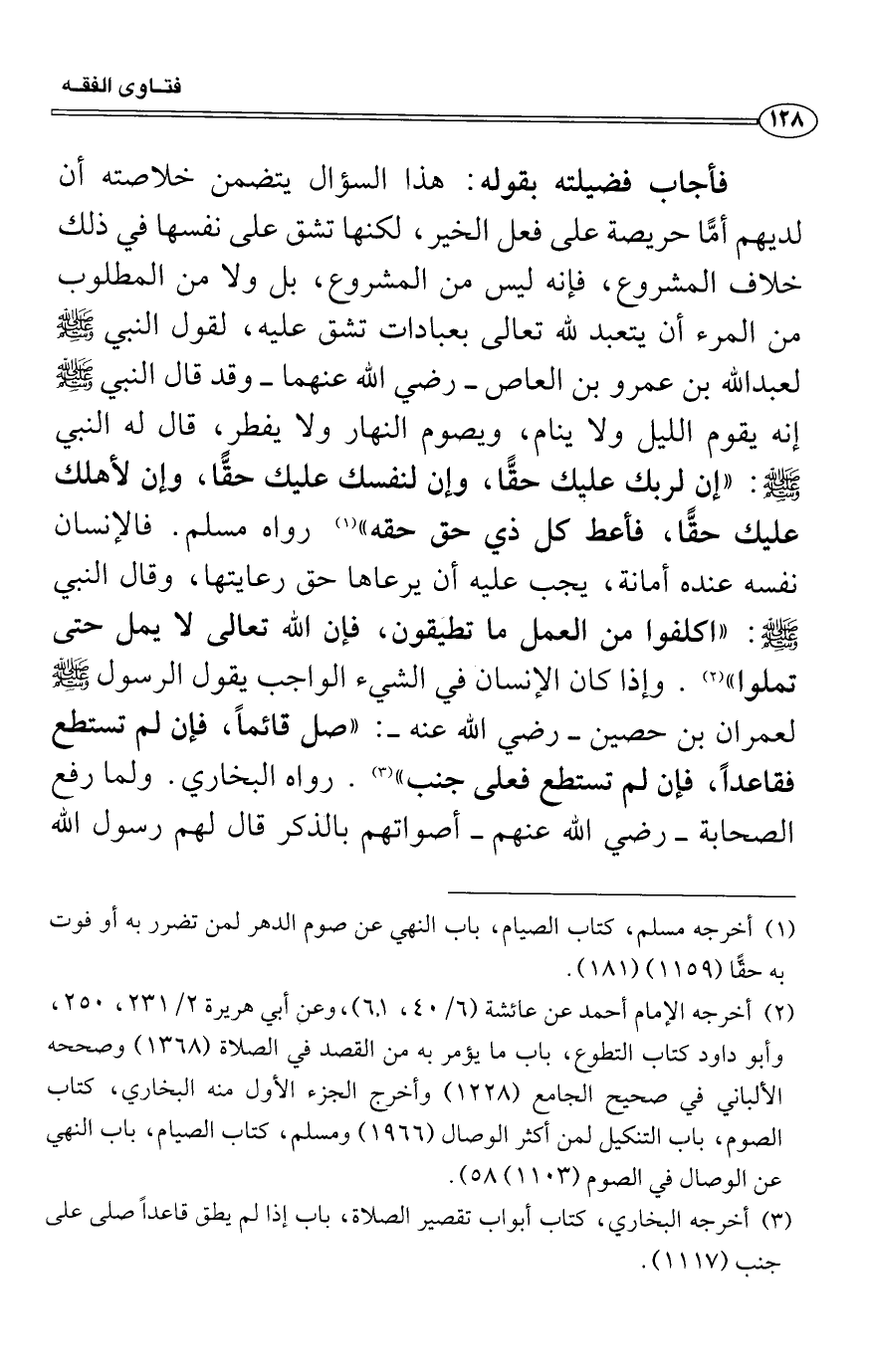 فأجاب فضيلته بقوله: هذا السؤال يتضمن خلاصته أن لديهم أمًّا حريصة على فعل الخير، لكنها تشق على نفسها في ذلك خلاف المشروع، فإنه ليس من المشروع، بل ولا من المطلوب من المرء أن يتعبد لله تعالى بعبادات تشق عليه، لقول النبي صَلَّى اللَّهُ عَلَيْهِ وَسَلَّمَ لعبد الله بن عمرو بن العاص رضي الله عنهما وقد قال النبي صَلَّى اللَّهُ عَلَيْهِ وَسَلَّمَ إنه يقوم الليل ولا ينام، ويصوم النهار ولا يفطر، قال له النبي صَلَّى اللَّهُ عَلَيْهِ وَسَلَّمَ: «إن لربك عليك حقًّا، وإن لنفسك عليك حقًّا، وإن لأهلك عليك حقًّا، فأعط كل ذي حق حقه» رواه مسلم. فالإنسان نفسه عنده أمانة، يجب عليه أن يرعاها حق رعايتها، وقال النبي صَلَّى اللَّهُ عَلَيْهِ وَسَلَّمَ: «اكلفوا من العمل ما تطيقون، فإن الله تعالى لا يمل حتى تملوا» . وإذا كان الإنسان في الشيء الواجب يقول الرسول صَلَّى اللَّهُ عَلَيْهِ وَسَلَّمَ لعمران بن حصين رضي الله عنه: «صل قائماً، فإن لم تستطع فقاعداً، فإن لم تستطع فعلى جنب» . رواه البخاري. ولما رفع الصحابة رضي الله عنهم أصواتهم بالذكر قال لهم رسول الله صَلَّى اللَّهُ عَلَيْهِ وَسَلَّمَ: «