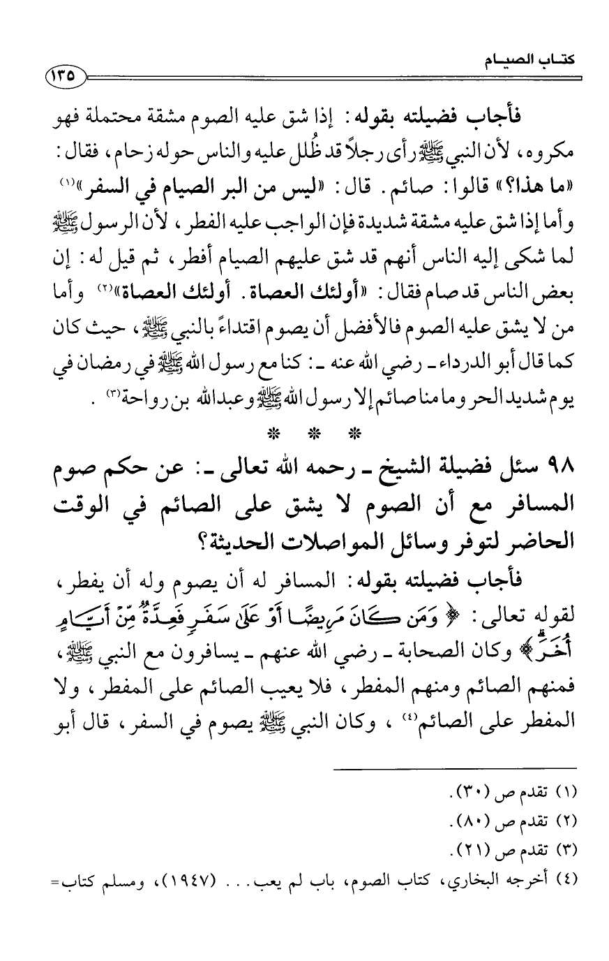فأجاب فضيلته بقوله: إذا شق عليه الصوم مشقة محتملة فهو مكروه، لأن النبي صَلَّى اللَّهُ عَلَيْهِ وَسَلَّمَ رأى رجلاً قد ظُلل عليه والناس حوله زحام، فقال: «ما هذا؟» قالوا: صائم. قال: «ليس من البر الصيام في السفر» وأما إذا شق عليه مشقة شديدة فإن الواجب عليه الفطر، لأن الرسول صَلَّى اللَّهُ عَلَيْهِ وَسَلَّمَ لما شكى إليه الناس أنهم قد شق عليهم الصيام أفطر، ثم قيل له: إن بعض الناس قد صام فقال: «أولئك العصاة. أولئك العصاة» وأما من لا يشق عليه الصوم فالأفضل أن يصوم اقتداءً بالنبي صَلَّى اللَّهُ عَلَيْهِ وَسَلَّمَ، حيث كان كما قال أبو الدرداء رضي الله عنه: كنا مع رسول الله صَلَّى اللَّهُ عَلَيْهِ وَسَلَّمَ في رمضان في يوم شديد الحر وما منا صائم إلا رسول الله صَلَّى اللَّهُ عَلَيْهِ وَسَلَّمَ وعبد الله بن رواحة.