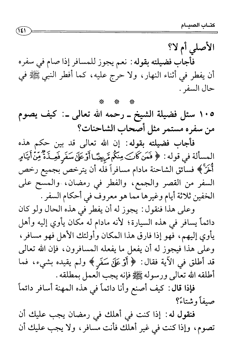 وعلى هذا فنقول: يجوز له أن يفطر في هذه الحال ولو كان دائماً يسافر في هذه السيارة؛ لأنه مادام له مكان يأوي إليه وأهل يأوي إليهم، فهو إذا فارق هذا المكان وأولئك الأهل فهو مسافر، وعلى هذا فيجوز له أن يفعل ما يفعله المسافرون، فإن الله تعالى قد أطلق في الآية فقال: {أَوْ عَلَى سَفَرٍ فَعِدَّةٌ مِّنْ أَيَّامٍ أُخَرَ وَعَلَى الَّذِينَ يُطِيقُونَهُ فِدْيَةٌ طَعَامُ مِسْكِينٍ فَمَن تَطَوَّعَ خَيْرًا فَهُوَ خَيْرٌ لَّهُ وَأَن تَصُومُواْ خَيْرٌ لَّكُمْ إِن كُنتُمْ تَعْلَمُونَ} ولم يقيده بشيء، فما أطلقه الله تعالى ورسوله صَلَّى اللَّهُ عَلَيْهِ وَسَلَّمَ فإنه يجب العمل بمطلقه.