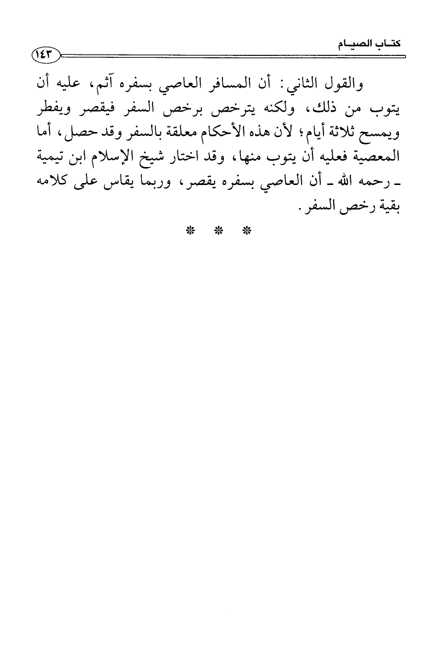 والقول الثاني: أن المسافر العاصي بسفره آثم، عليه أن يتوب من ذلك، ولكنه يترخص برخص السفر فيقصر ويفطر ويمسح ثلاثة أيام؛ لأن هذه الأحكام معلقة بالسفر وقد حصل، أما المعصية فعليه أن يتوب منها، وقد اختار شيخ الإسلام ابن تيمية رحمه الله أن العاصي بسفره يقصر، وربما يقاس على كلامه بقية رخص السفر.
