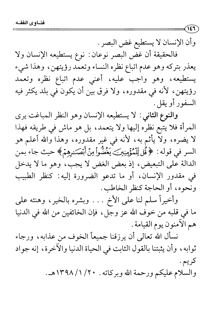 والنوع الثاني: لا يستطيعه الإنسان وهو النظر المباغت يرى المرأة فلا يتبع نظره إليها ولا يتعمد، بل هو ماش في طريقه فهذا لا يضره، ولا يأثم به، لأنه في غير مقدوره، وهذا والله أعلم هو السر في قوله: {قُلْ لِّلْمُؤْمِنِينَ يَغُضُّواْ مِنْ أَبْصَارِهِمْ وَيَحْفَظُواْ فُرُوجَهُمْ ذالِكَ أَزْكَى لَهُمْ إِنَّ اللهَ خَبِيرٌ بِمَا يَصْنَعُونَ} حيث جاء بمن الدالة على التبعيض، إذ بعض الغض لا يجب، وهو ما لا يدخل في مقدور الإنسان، أو ما تدعو الضرورة إليه: كنظر الطبيب ونحوه، أو الحاجة كنظر الخاطب.