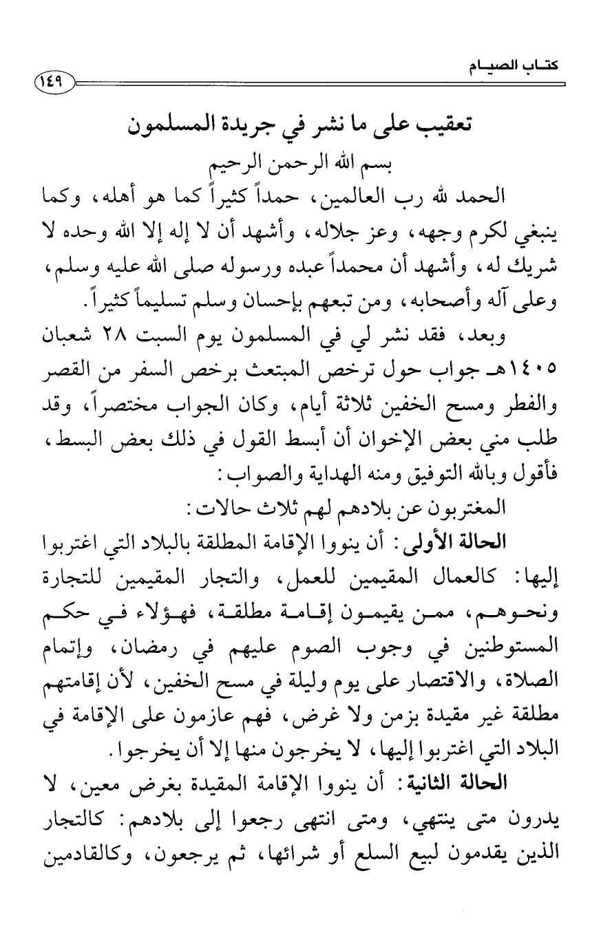 وبعد، فقد نشر لي في المسلمون يوم السبت 28 شعبان 1405 هـ جواب حول ترخص المبتعث برخص السفر من القصر والفطر ومسح الخفين ثلاثة أيام، وكان الجواب مختصراً، وقد طلب مني بعض الإخوان أن أبسط القول في ذلك بعض البسط، فأقول وبالله التوفيق ومنه الهداية والصواب: