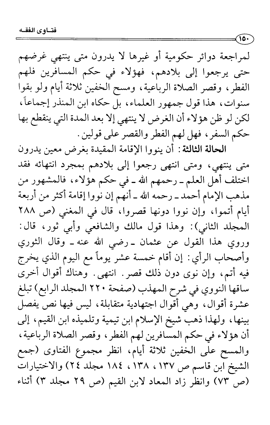 الحالة الثالثة: أن ينووا الإقامة المقيدة بغرض معين يدرون متى ينتهي، ومتى انتهى رجعوا إلى بلادهم بمجرد انتهائه فقد اختلف أهل العلم رحمهم الله في حكم هؤلاء، فالمشهور من مذهب الإمام أحمد رحمه الله أنهم إن نووا إقامة أكثر من أربعة أيام أتموا، وإن نووا دونها قصروا، قال في المغني (ص 882 المجلد الثاني) : وهذا قول مالك والشافعي وأبي ثور، قال: وروي هذا القول عن عثمان رضي الله عنه وقال الثوري وأصحاب الرأي: إن أقام خمسة عشر يوماً مع اليوم الذي يخرج فيه أتم، وإن نوى دون ذلك قصر. انتهى. وهناك أقوال أخرى ساقها النووي في شرح المهذب (صفحة 022 المجلد الرابع) تبلغ عشرة أقوال، وهي أقوال اجتهادية متقابلة، ليس فيها نص يفصل بينها، ولهذا ذهب شيخ الإسلام ابن تيمية وتلميذه ابن القيم، إلى أن هؤلاء في حكم المسافرين لهم الفطر، وقصر الصلاة الرباعية، والمسح على الخفين ثلاثة أيام، انظر مجموع الفتاوى (جمع الشيخ ابن قاسم ص 731، 831، 481 مجلد 42) والاختيارات (ص 37) وانظر زاد المعاد لابن القيم (ص 92 مجلد 3) أثناء