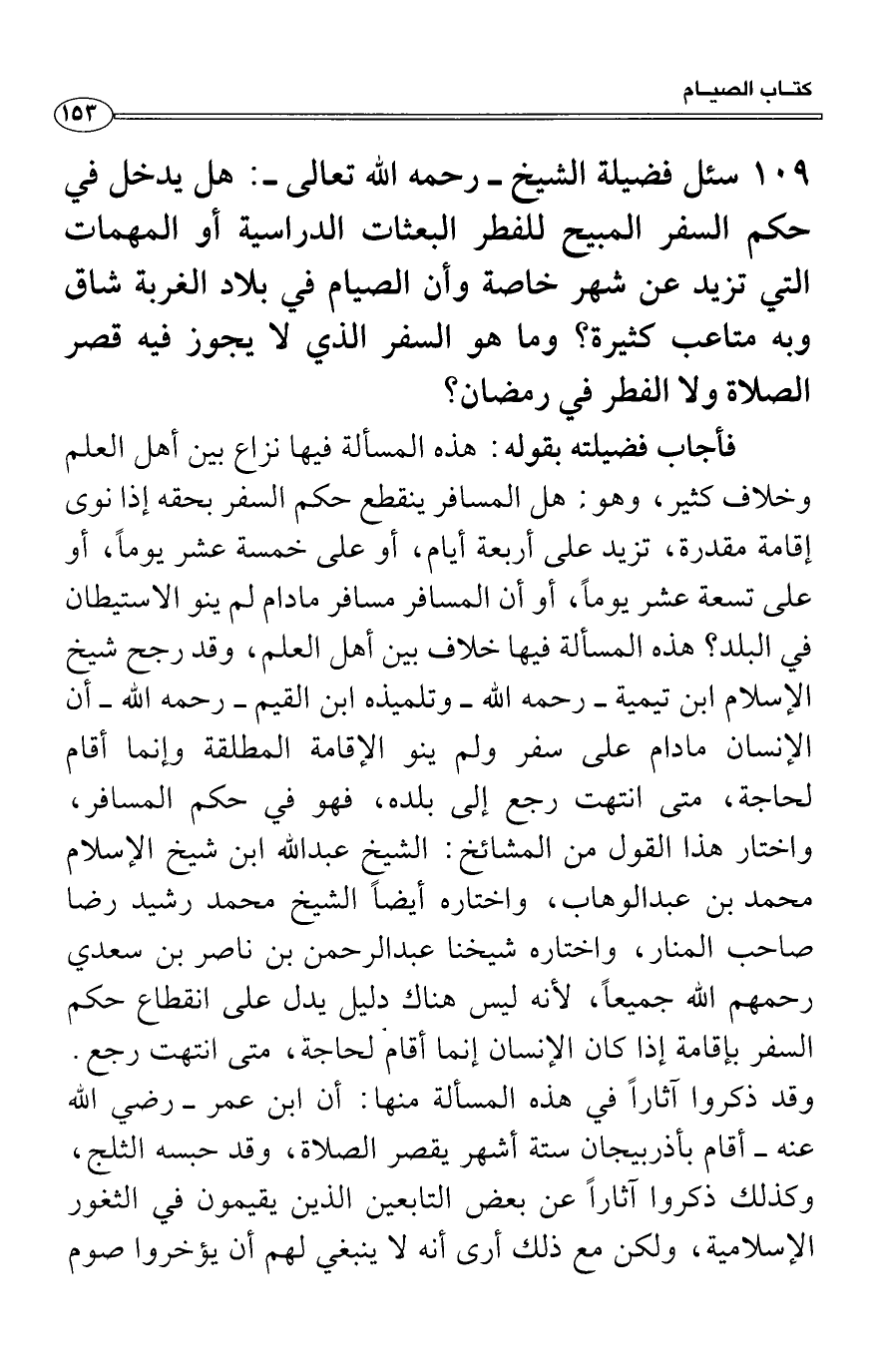 سئل فضيلة الشيخ - رحمه الله تعالى -: هل يدخل في حكم السفر المبيح للفطر البعثات الدراسية أو المهمات التي تزيد عن شهر خاصة وأن الصيام في بلاد الغربة شاق وبه متاعب كثيرة؟ وما هو السفر الذي لا يجوز فيه قصر الصلاة ولا الفطر في رمضان؟