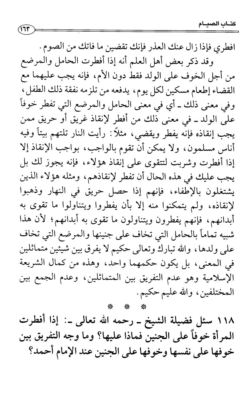 سئل فضيلة الشيخ - رحمه الله تعالى -: إذا أفطرت المرأة خوفاً على الجنين فماذا عليها؟ وما وجه التفريق بين خوفها على نفسها وخوفها على الجنين عند الإمام أحمد؟