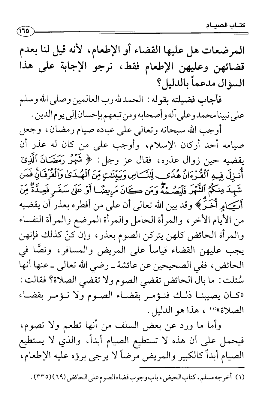 أوجب الله سبحانه وتعالى على عباده صيام رمضان، وجعل صيامه أحد أركان الإسلام، وأوجب على من كان له عذر أن يقضيه حين زوال عذره، فقال عز وجل: {شَهْرُ رَمَضَانَ الَّذِى" أُنزِلَ فِيهِ الْقُرْآنُ هُدًى لِّلنَّاسِ وَبَيِّنَاتٍ مِّنَ الْهُدَى وَالْفُرْقَانِ فَمَن شَهِدَ مِنكُمُ الشَّهْرَ فَلْيَصُمْهُ وَمَن كَانَ مَرِيضًا أَوْ عَلَى سَفَرٍ فَعِدَّةٌ مِّنْ أَيَّامٍ أُخَرَ يُرِيدُ اللهُ بِكُمُ الْيُسْرَ وَلاَ يُرِيدُ بِكُمُ الْعُسْرَ وَلِتُكْمِلُواْ الْعِدَّةَ وَلِتُكَبِّرُواْ اللهَ عَلَى مَا هَدَاكُمْ وَلَعَلَّكُمْ تَشْكُرُونَ} وقد بين الله تعالى أن على من أفطره بعذر أن يقضيه من الأيام الأخر، والمرأة الحامل والمرأة المرضع والمرأة النفساء والمرأة الحائض كلهن يتركن الصوم بعذر، وإن كنّ كذلك فإنهن يجب عليهن القضاء قياساً على المريض والمسافر، ونصًّا في الحائض، ففي الصحيحين عن عائشة رضي الله تعالى عنها أنها سُئلت: ما بال الحائض تقضي الصوم ولا تقضي الصلاة؟ فقالت: «كان يصيبنا ذلك فنؤمر بقضاء الصوم ولا نؤمر بقضاء الصلاة» ، هذا هو الدليل.