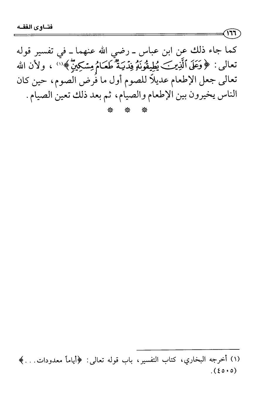 كما جاء ذلك عن ابن عباس رضي الله عنهما في تفسير قوله تعالى: {وَعَلَى الَّذِينَ يُطِيقُونَهُ فِدْيَةٌ طَعَامُ مِسْكِينٍ فَمَن تَطَوَّعَ خَيْرًا فَهُوَ خَيْرٌ لَّهُ وَأَن تَصُومُواْ خَيْرٌ لَّكُمْ إِن كُنتُمْ تَعْلَمُونَ} ، ولأن الله تعالى جعل الإطعام عديلاً للصوم أول ما فُرض الصوم، حين كان الناس يخيرون بين الإطعام والصيام، ثم بعد ذلك تعين الصيام.