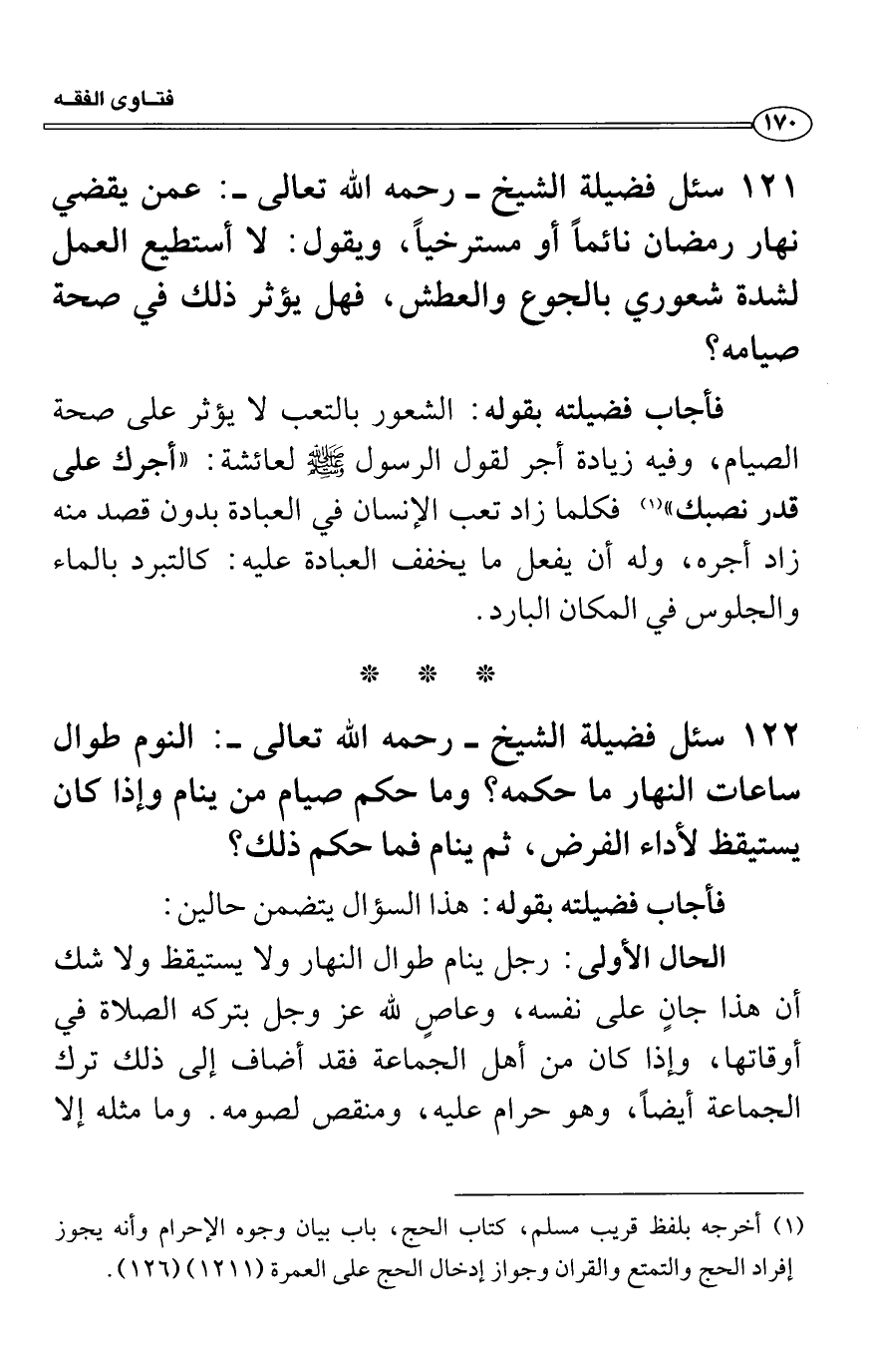 سئل فضيلة الشيخ - رحمه الله تعالى -: عمن يقضي نهار رمضان نائماً أو مسترخياً، ويقول: لا أستطيع العمل لشدة شعوري بالجوع والعطش، فهل يؤثر ذلك في صحة صيامه؟