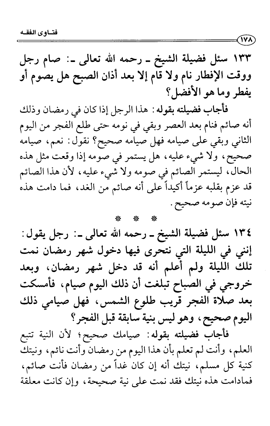 فأجاب فضيلته بقوله: هذا الرجل إذا كان في رمضان وذلك أنه صائم فنام بعد العصر وبقي في نومه حتى طلع الفجر من اليوم الثاني وبقي على صيامه فهل صيامه صحيح؟ نقول: نعم، صيامه صحيح، ولا شيء عليه، هل يستمر في صومه إذا وقعت مثل هذه الحال، ليستمر الصائم في صومه ولا شيء عليه، لأن هذا الصائم قد عزم بقلبه عزماً أكيداً على أنه صائم من الغد، فما دامت هذه نيته فإن صومه صحيح.