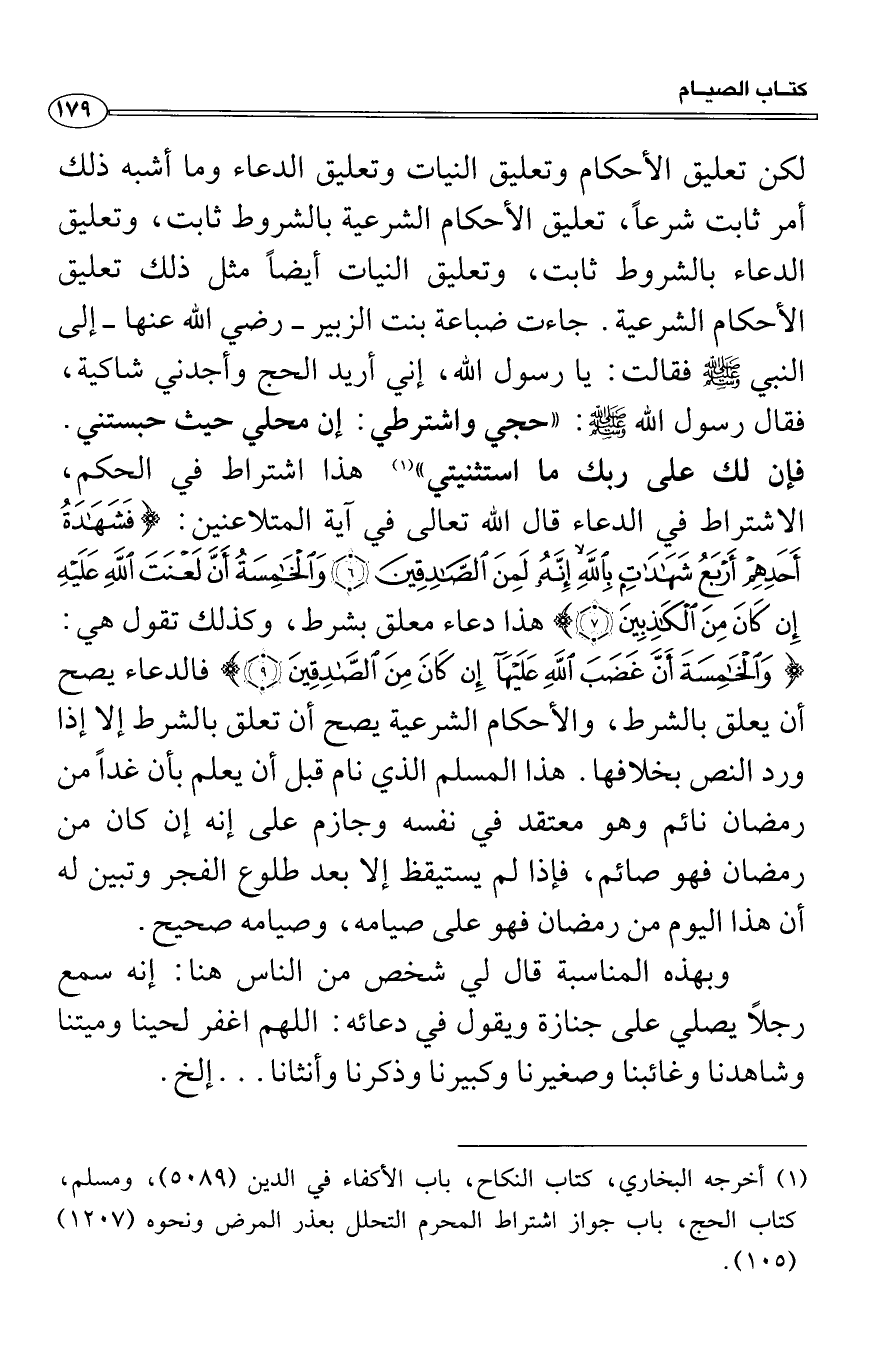 لكن تعليق الأحكام وتعليق النيات وتعليق الدعاء وما أشبه ذلك أمر ثابت شرعاً، تعليق الأحكام الشرعية بالشروط ثابت، وتعليق الدعاء بالشروط ثابت، وتعليق النيات أيضاً مثل ذلك تعليق الأحكام الشرعية. جاءت ضباعة بنت الزبير رضي الله عنها إلى النبي صَلَّى اللَّهُ عَلَيْهِ وَسَلَّمَ فقالت: يا رسول الله، إني أريد الحج وأجدني شاكية، فقال رسول الله صَلَّى اللَّهُ عَلَيْهِ وَسَلَّمَ: «حجي واشترطي: إن محلي حيث حبستني. فإن لك على ربك ما استثنيتي» هذا اشتراط في الحكم، الاشتراط في الدعاء قال الله تعالى في آية المتلاعنين: {فَشَهَادَةُ أَحَدِهِمْ أَرْبَعُ شَهَادَاتٍ بِاللهِ إِنَّهُ لَمِنَ الصَّادِقِينَ * وَالْخَامِسَةُ أَنَّ لَعْنَةَ اللهِ عَلَيْهِ إِن كَانَ مِنَ الْكَاذِبِينَ} هذا دعاء معلق بشرط، وكذلك تقول هي: {وَالْخَامِسَةَ أَنَّ غَضَبَ اللهِ عَلَيْهَآ إِن كَانَ مِنَ الصَّادِقِينَ} فالدعاء يصح أن يعلق بالشرط، والأحكام الشرعية يصح أن تعلق بالشرط إلا إذا ورد النص بخلافها. هذا المسلم الذي نام قبل أن يعلم بأن غداً من رمضان نائم وهو معتقد في نفسه وجازم على إنه إن كان من رمضان فهو صائم، فإذا لم يستيقظ إلا بعد طلوع الفجر وتبين له أن هذا اليوم من رمضان فهو على صيامه، وصيامه صحيح.