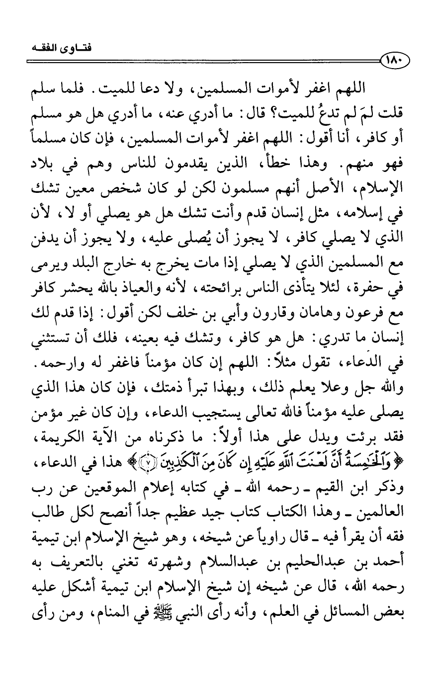 اللهم اغفر لأموات المسلمين، ولا دعا للميت. فلما سلم قلت لمَ لم تدعُ للميت؟ قال: ما أدري عنه، ما أدري هل هو مسلم أو كافر، أنا أقول: اللهم اغفر لأموات المسلمين، فإن كان مسلماً فهو منهم. وهذا خطأ، الذين يقدمون للناس وهم في بلاد الإسلام، الأصل أنهم مسلمون لكن لو كان شخص معين تشك في إسلامه، مثل إنسان قدم وأنت تشك هل هو يصلي أو لا، لأن الذي لا يصلي كافر، لا يجوز أن يُصلى عليه، ولا يجوز أن يدفن مع المسلمين الذي لا يصلي إذا مات يخرج به خارج البلد ويرمى في حفرة، لئلا يتأذى الناس برائحته، لأنه والعياذ بالله يحشر كافر مع فرعون وهامان وقارون وأبي بن خلف لكن أقول: إذا قدم لك إنسان ما تدري: هل هو كافر، وتشك فيه بعينه، فلك أن تستثني في الدعاء، تقول مثلاً: اللهم إن كان مؤمناً فاغفر له وارحمه. والله جل وعلا يعلم ذلك، وبهذا تبرأ ذمتك، فإن كان هذا الذي يصلى عليه مؤمناً فالله تعالى يستجيب الدعاء، وإن كان غير مؤمن فقد برئت ويدل على هذا أولاً: ما ذكرناه من الآية الكريمة، {وَالْخَامِسَةُ أَنَّ لَعْنَةَ اللهِ عَلَيْهِ إِن كَانَ مِنَ الْكَاذِبِينَ} هذا في الدعاء، وذكر ابن القيم رحمه الله في كتابه إعلام الموقعين عن رب العالمين وهذا الكتاب كتاب جيد عظيم جداً أنصح لكل طالب فقه أن يقرأ فيه قال راوياً عن شيخه، وهو شيخ الإسلام ابن تيمية أحمد بن عبد الحليم بن عبد السلام وشهرته تغني بالتعريف به رحمه الله، قال عن شيخه إن شيخ الإسلام ابن تيمية أشكل عليه بعض المسائل في العلم، وأنه رأى النبي صَلَّى اللَّهُ عَلَيْهِ وَسَلَّمَ في المنام، ومن رأى