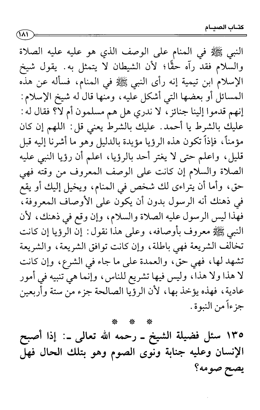 النبي صَلَّى اللَّهُ عَلَيْهِ وَسَلَّمَ في المنام على الوصف الذي هو عليه عليه الصلاة والسلام فقد رآه حقًّا؛ لأن الشيطان لا يتمثل به. يقول شيخ الإسلام ابن تيمية إنه رأى النبي صَلَّى اللَّهُ عَلَيْهِ وَسَلَّمَ في المنام، فسأله عن هذه المسائل أو بعضها التي أشكل عليه، ومنها قال له شيخ الإسلام: إنهم قدموا
