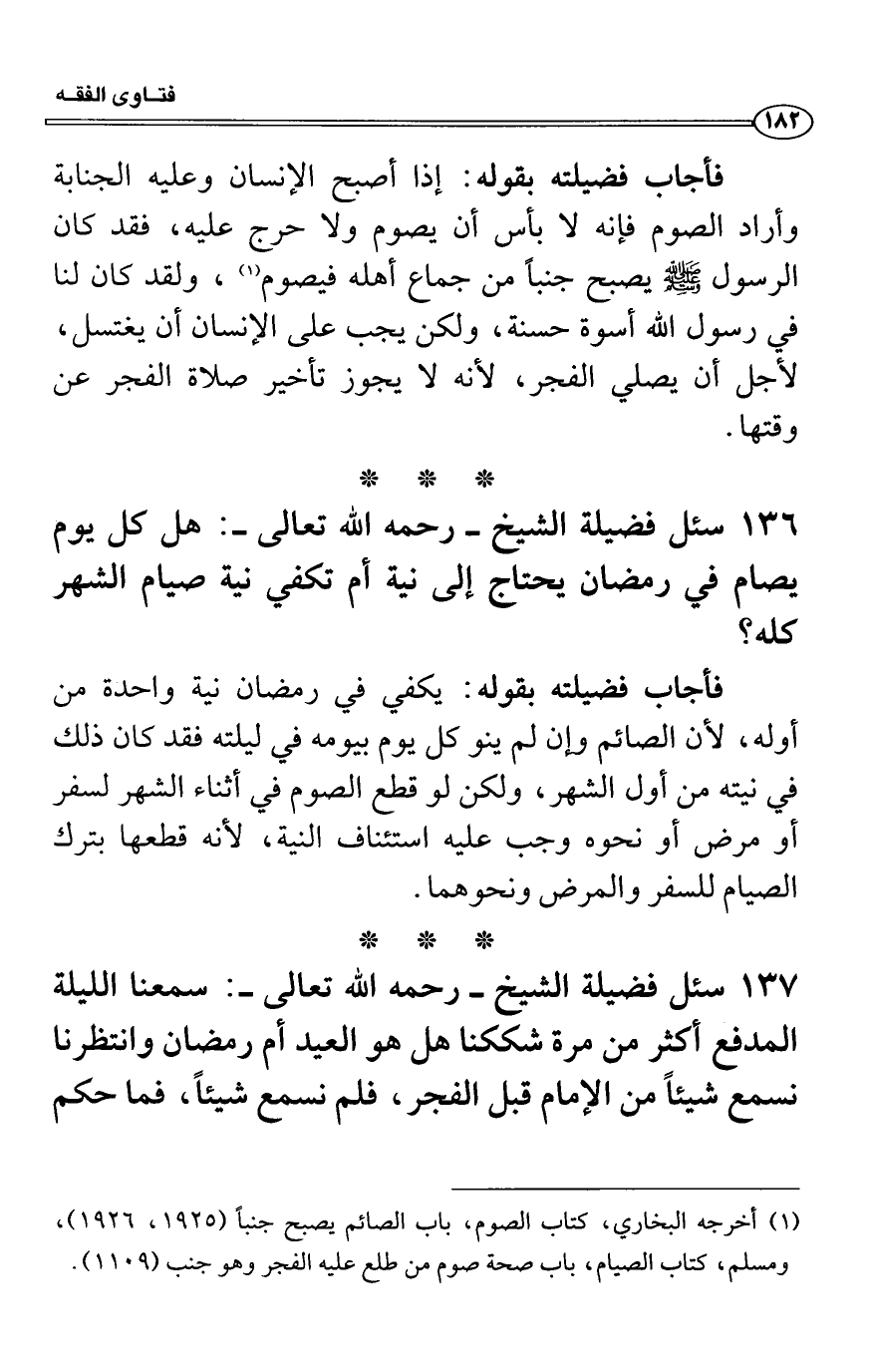 فأجاب فضيلته بقوله: يكفي في رمضان نية واحدة من أوله، لأن الصائم وإن لم ينو كل يوم بيومه في ليلته فقد كان ذلك في نيته من أول الشهر، ولكن لو قطع الصوم في أثناء الشهر لسفر أو مرض أو نحوه وجب عليه استئناف النية، لأنه قطعها بترك الصيام للسفر والمرض ونحوهما.