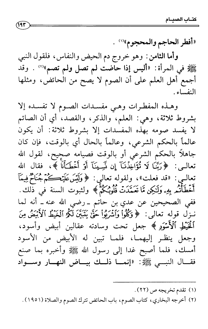 وأما الثامن: وهو خروج دم الحيض والنفاس، فلقول النبي صَلَّى اللَّهُ عَلَيْهِ وَسَلَّمَ في المرأة: «أليس إذا حاضت لم تصل ولم تصم» . وقد أجمع أهل العلم على أن الصوم لا يصح من الحائض، ومثلها النفساء.
