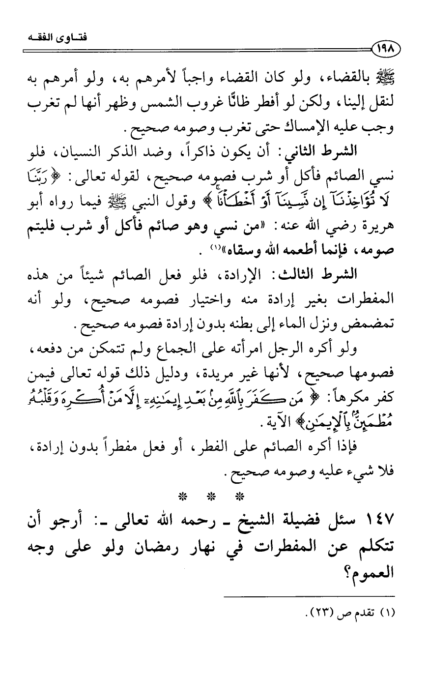 سئل فضيلة الشيخ - رحمه الله تعالى -: أرجو أن تتكلم عن المفطرات في نهار رمضان ولو على وجه العموم؟