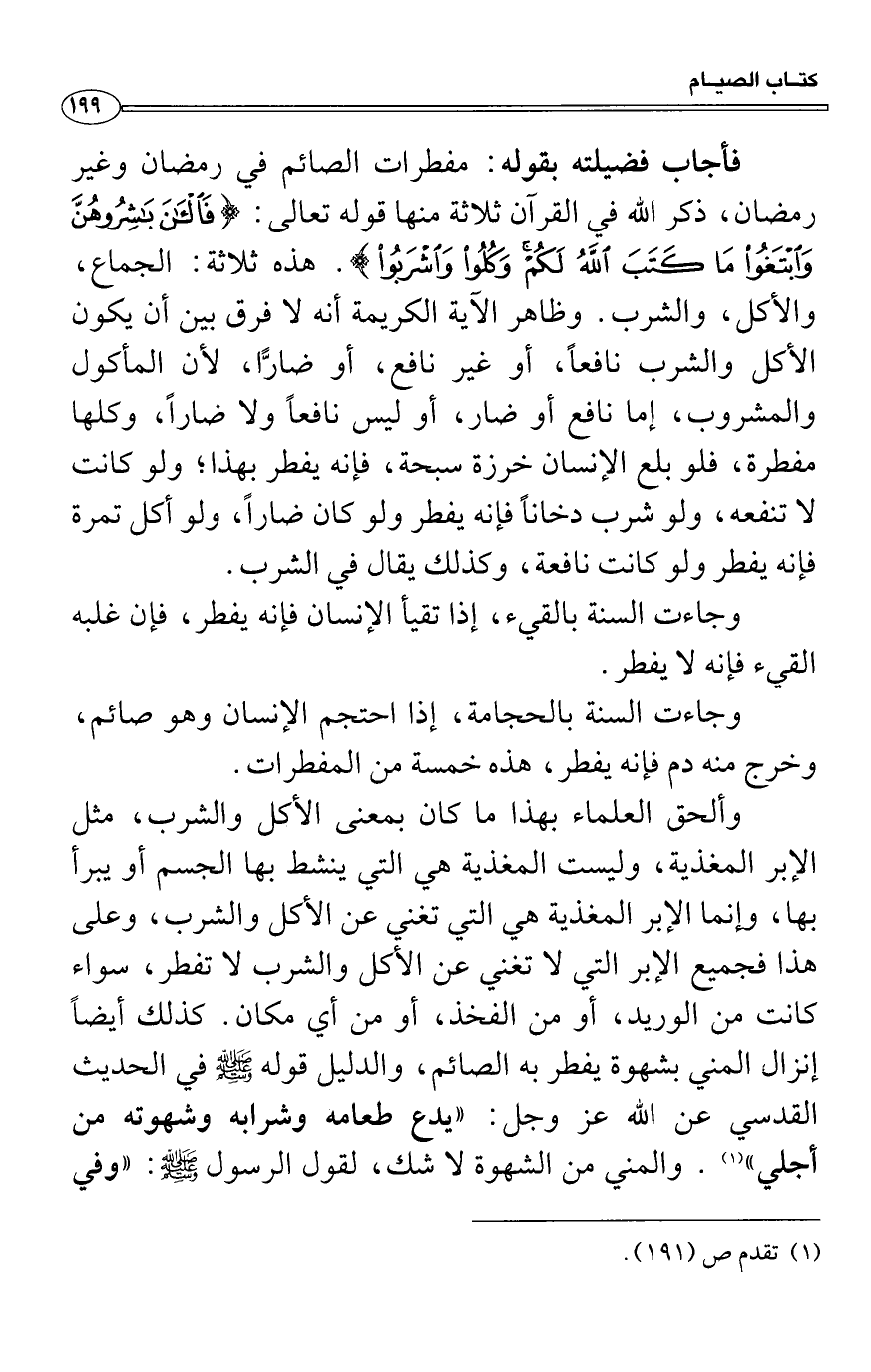 وألحق العلماء بهذا ما كان بمعنى الأكل والشرب، مثل الإبر المغذية، وليست المغذية هي التي ينشط بها الجسم أو يبرأ بها، وإنما الإبر المغذية هي التي تغني عن الأكل والشرب، وعلى هذا فجميع الإبر التي لا تغني عن الأكل والشرب لا تفطر، سواء كانت من الوريد، أو من الفخذ، أو من أي مكان. كذلك أيضاً إنزال المني بشهوة يفطر به الصائم، والدليل قوله صَلَّى اللَّهُ عَلَيْهِ وَسَلَّمَ في الحديث القدسي عن الله عز وجل: «يدع طعامه وشرابه وشهوته من أجلي» . والمني من الشهوة لا شك، لقول الرسول صَلَّى اللَّهُ عَلَيْهِ وَسَلَّمَ: «وفي