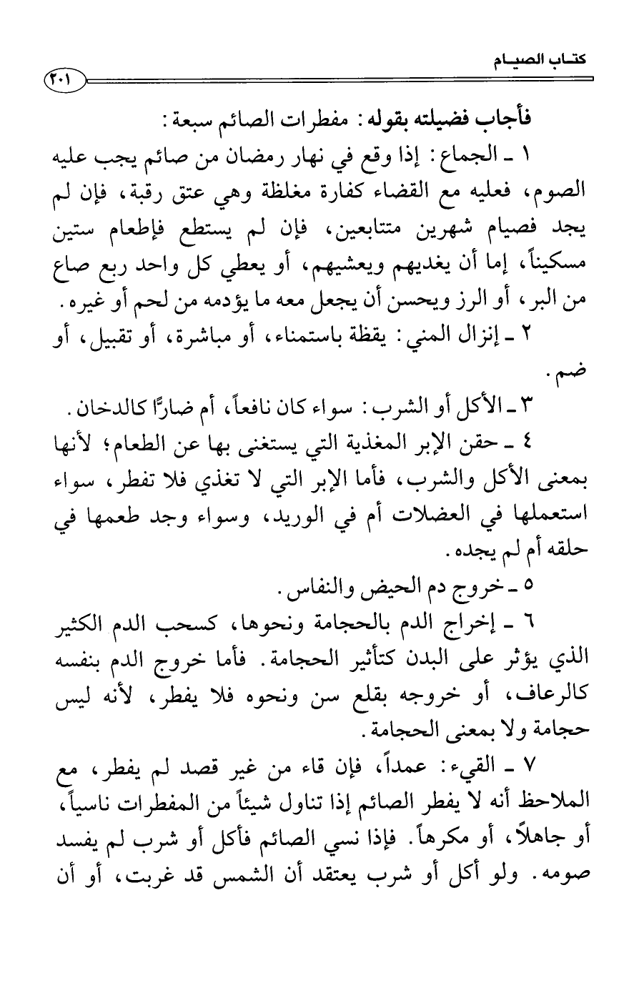 7 القيء: عمداً، فإن قاء من غير قصد لم يفطر، مع الملاحظ أنه لا يفطر الصائم إذا تناول شيئاً من المفطرات ناسياً، أو جاهلاً، أو مكرهاً. فإذا نسي الصائم فأكل أو شرب لم يفسد صومه. ولو أكل أو شرب يعتقد أن الشمس قد غربت، أو أن