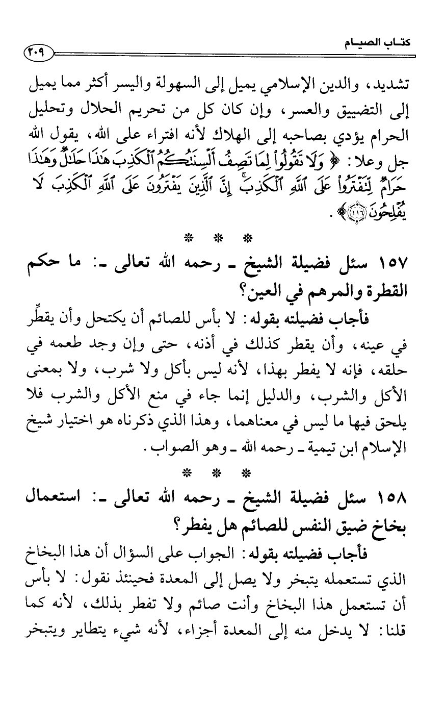 فأجاب فضيلته بقوله: لا بأس للصائم أن يكتحل وأن يقطِّر في عينه، وأن يقطر كذلك في أذنه، حتى وإن وجد طعمه في حلقه، فإنه لا يفطر بهذا، لأنه ليس بأكل ولا شرب، ولا بمعنى الأكل والشرب، والدليل إنما جاء في منع الأكل والشرب فلا يلحق فيها ما ليس في معناهما، وهذا الذي ذكرناه هو اختيار شيخ الإسلام ابن تيمية رحمه الله وهو الصواب.