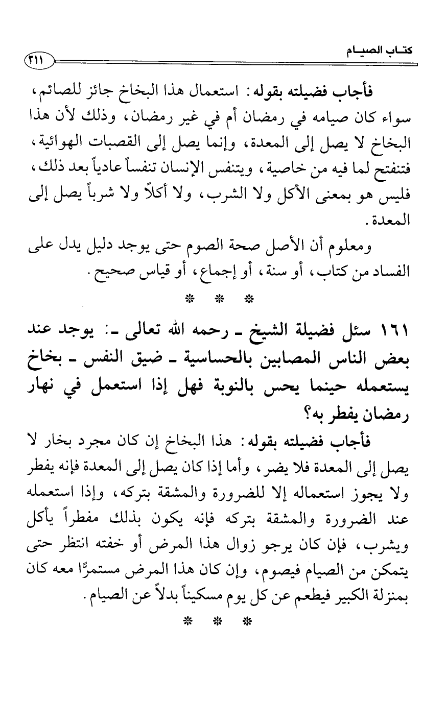 فأجاب فضيلته بقوله: هذا البخاخ إن كان مجرد بخار لا يصل إلى المعدة فلا يضر، وأما إذا كان يصل إلى المعدة فإنه يفطر ولا يجوز استعماله إلا للضرورة والمشقة بتركه، وإذا استعمله عند الضرورة والمشقة بتركه فإنه يكون بذلك مفطراً يأكل ويشرب، فإن كان يرجو زوال هذا المرض أو خفته انتظر حتى يتمكن من الصيام فيصوم، وإن كان هذا المرض مستمرًّا معه كان بمنزلة الكبير فيطعم عن كل يوم مسكيناً بدلاً عن الصيام.