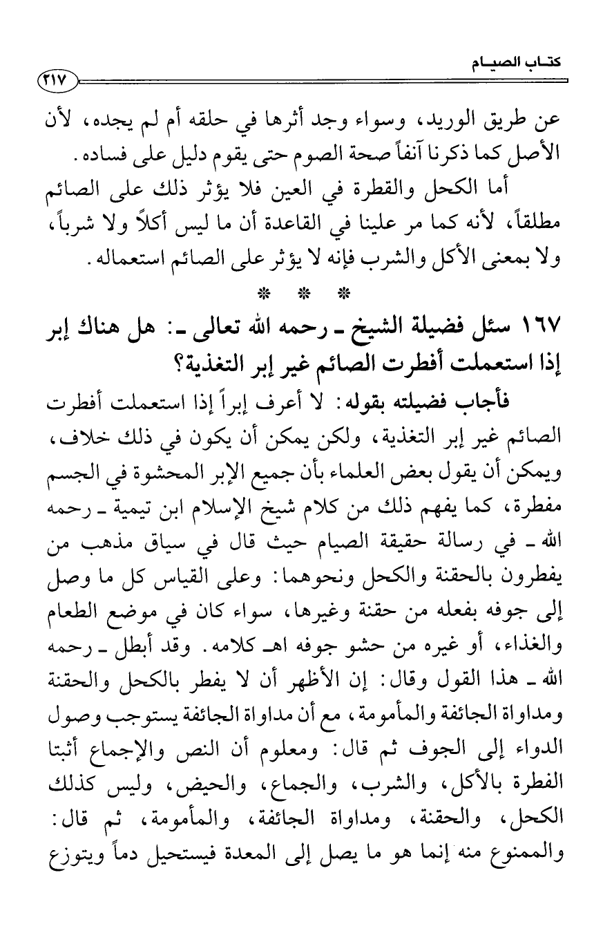 فأجاب فضيلته بقوله: لا أعرف إبراً إذا استعملت أفطرت الصائم غير إبر التغذية، ولكن يمكن أن يكون في ذلك خلاف، ويمكن أن يقول بعض العلماء بأن جميع الإبر المحشوة في الجسم مفطرة، كما يفهم ذلك من كلام شيخ الإسلام ابن تيمية رحمه الله في رسالة حقيقة الصيام حيث قال في سياق مذهب من يفطرون بالحقنة والكحل ونحوهما: وعلى القياس كل ما وصل إلى جوفه بفعله من حقنة وغيرها، سواء كان في موضع الطعام والغذاء، أو غيره من حشو جوفه اه كلامه. وقد أبطل رحمه الله هذا القول وقال: إن الأظهر أن لا يفطر بالكحل والحقنة ومداواة الجائفة والمأمومة، مع أن مداواة الجائفة يستوجب وصول الدواء إلى الجوف ثم قال: ومعلوم أن النص والإجماع أثبتا الفطرة بالأكل، والشرب، والجماع، والحيض، وليس كذلك الكحل، والحقنة، ومداواة الجائفة، والمأمومة، ثم قال: والممنوع منه إنما هو ما يصل إلى المعدة فيستحيل دماً ويتوزع
