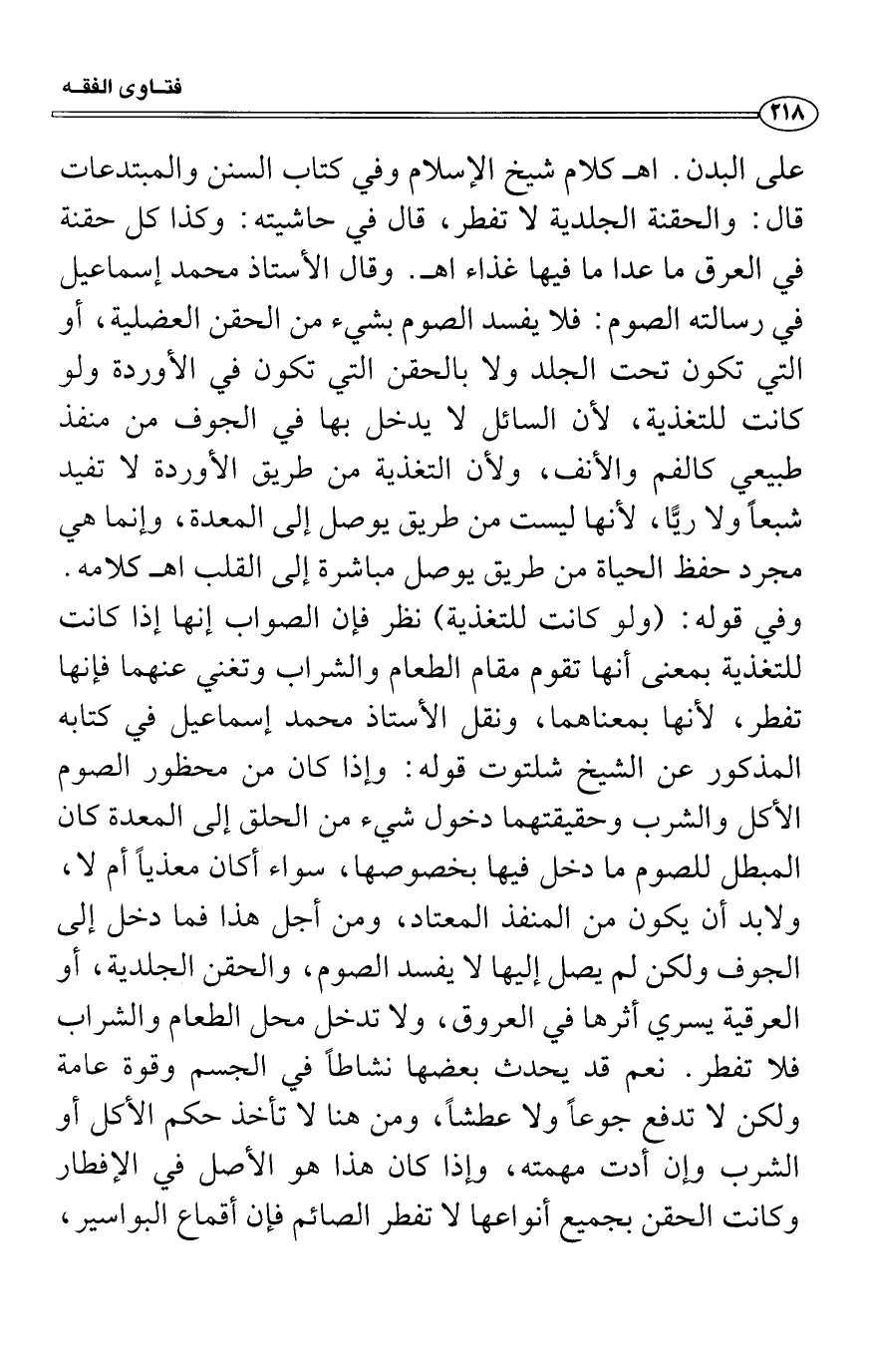 على البدن. اه كلام شيخ الإسلام وفي كتاب السنن والمبتدعات قال: والحقنة الجلدية لا تفطر، قال في حاشيته: وكذا كل حقنة في العرق ما عدا ما فيها غذاء اه. وقال الأستاذ محمد إسماعيل في رسالته الصوم: فلا يفسد الصوم بشيء من الحقن العضلية، أو التي تكون تحت الجلد ولا بالحقن التي تكون في الأوردة ولو كانت للتغذية، لأن السائل لا يدخل بها في الجوف من منفذ طبيعي كالفم والأنف، ولأن التغذية من طريق الأوردة لا تفيد شبعاً ولا ريًّا، لأنها ليست من طريق يوصل إلى المعدة، وإنما هي مجرد حفظ الحياة من طريق يوصل مباشرة إلى القلب اه كلامه. وفي قوله: (ولو كانت للتغذية) نظر فإن الصواب إنها إذا كانت للتغذية بمعنى أنها تقوم مقام الطعام والشراب وتغني عنهما فإنها تفطر، لأنها بمعناهما، ونقل الأستاذ محمد إسماعيل في كتابه المذكور عن الشيخ شلتوت قوله: وإذا كان من محظور الصوم الأكل والشرب وحقيقتهما دخول شيء من الحلق إلى المعدة كان المبطل للصوم ما دخل