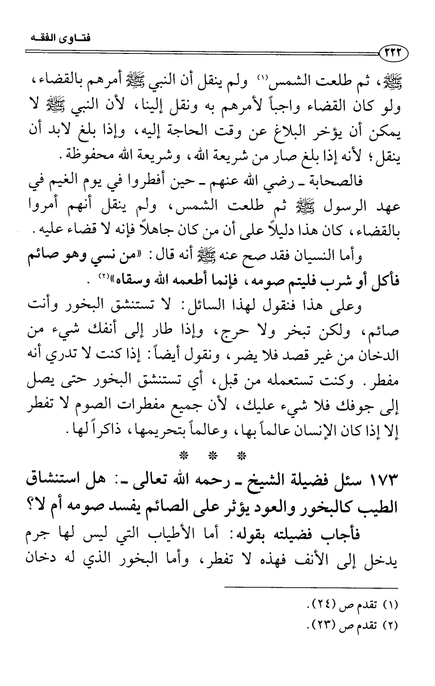 وعلى هذا فنقول لهذا السائل: لا تستنشق البخور وأنت صائم، ولكن تبخر ولا حرج، وإذا طار إلى أنفك شيء من الدخان من غير قصد فلا يضر، ونقول أيضاً: إذا كنت لا تدري أنه مفطر. وكنت تستعمله من قبل، أي تستنشق البخور حتى يصل إلى جوفك فلا شيء عليك، لأن جميع مفطرات الصوم لا تفطر إلا إذا كان الإنسان عالماً بها، وعالماً بتحريمها، ذاكراً لها.
