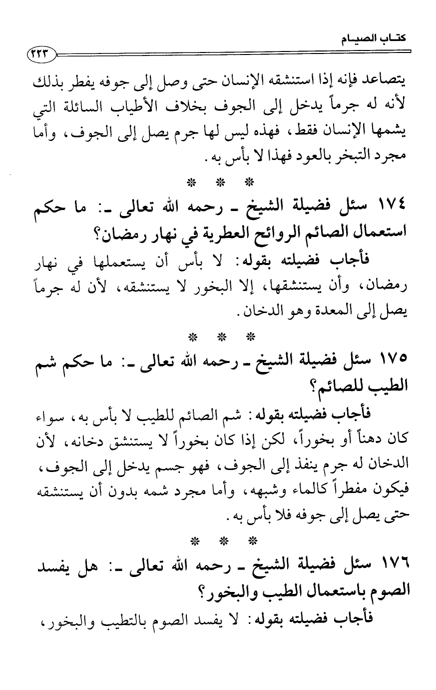 فأجاب فضيلته بقوله: لا بأس أن يستعملها في نهار رمضان، وأن يستنشقها، إلا البخور لا يستنشقه، لأن له جرماً يصل إلى المعدة وهو الدخان.