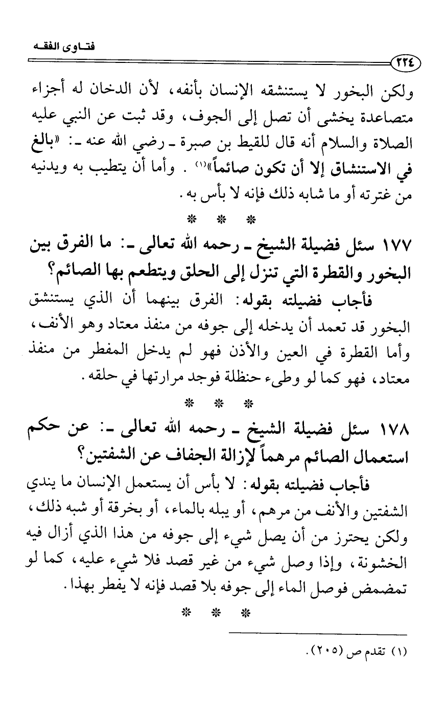 فأجاب فضيلته بقوله: الفرق بينهما أن الذي يستنشق البخور قد تعمد أن يدخله إلى جوفه من منفذ معتاد وهو الأنف، وأما القطرة في العين والأذن فهو لم يدخل المفطر من منفذ معتاد، فهو كما لو وطىء حنظلة فوجد مرارتها في حلقه.